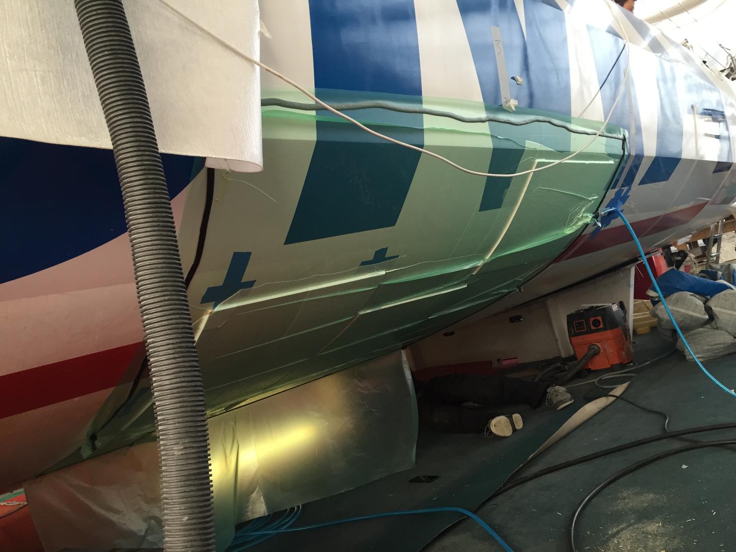 « Même s’il n’y a pas de problème structurel grave, le bateau a souffert pendant ses jours de dérive. Nous avons constaté un certain nombre de points d’impact, dû notamment à la galette de J2 (enrouleur de voile d’avant, ndr) qui venait régulièrement battre contre le flanc et la plage avant. Le bateau a également été rempli d’eau, ce qui nous a obligé à le vider entièrement, y compris, le moteur, ainsi que tous les systèmes embarqués (hydraulique, ballast, électronique, dessalinisateur etc.) et l’ensemble des câbles électriques. Nous avons dû découper des plaques de composites qui étaient imbibées d’eau tant sur le pont que sur le flanc et la coque du bateau. Nous réparons également le tableau arrière qui a été endommagé lors du sauvetage de Paul au large des Açores.»