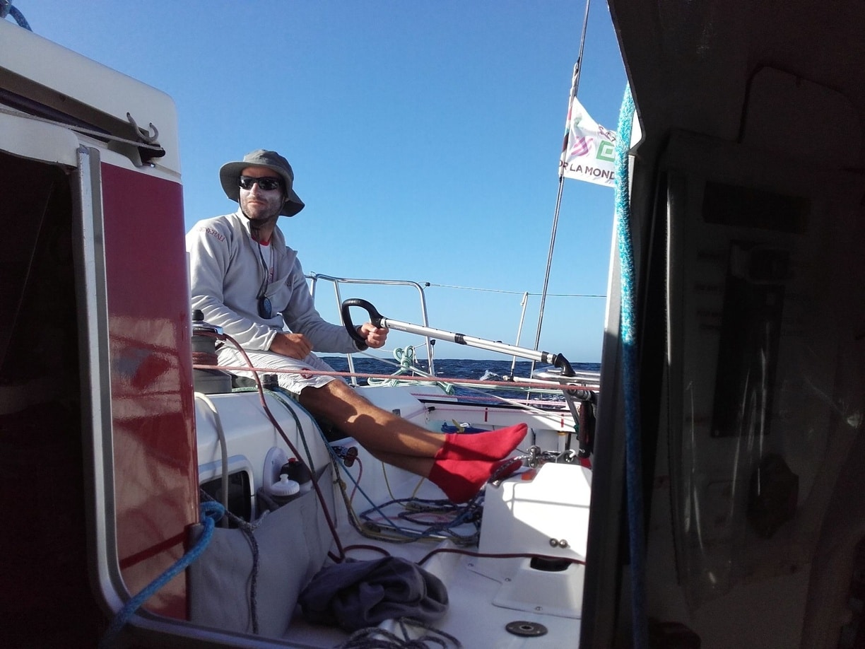 « Adrien est à la barre et moi je me réveille. On est en plein dans l’archipel du cap vert. On vient de passer tout près de Santa Maria, on est passés à un mille dans le nord de l’île. Dans une heure et demie on va empanner. On va passer au milieu du cap Vert. On a fait un recalage car le vent variait un petit peu. J’espère qu’on a gagné un peu, on verra ça bientôt. Je ne sais pas ce que va faire Gedimat. On ne se voit plus, il doit y avoir 10 – 12 milles de décalage entre nous. On ne sait pas s’ils vont vite ou pas. Au niveau de la mer et du vent, c’est un peu différent de ce que nous avons eu au large, il y a pas mal d’animaux marins qui arrivent sur le pont : des petits calamars et je me suis fait attaquer par un poisson volant. Il a failli m’assommer. Les conditions sont relativement stables, 20 nœuds. Le bateau marche bien à une dizaine de nœuds. C’est surtout dans les heures qui viennent qu’il va falloir négocier avec les dévents des îles. C’est un moment très important mais la route est encore super longue. Par la suite c’est possible qu’on fasse un seul bord en tribord amure jusqu’à Saint-Barth. Là on est déjà très sud, c’est la première fois que les concurrents de la transat passent aussi sud. Les deux empannages qu’il reste à caler sont très importants et j’espère que celui que nous avons fait ce midi, va être bénéfique. On essaie de récupérer mais ça prend du temps car la semaine a été très dure. Les quarts sont un peu plus longs. On peut s’alimenter correctement ce qui était moins le cas la première semaine de course. Il ne fait pas très chaud la nuit, on a toujours la polaire et le bonnet. Le jour, le soleil tape fort. Là je vais grignoter un petit truc, refaire un point navigation. Ensuite, j’enchainerai mon quart de nav’. Adrien s’occupe du matériel, il le déplace un peu vers l’avant car le vent a dû mollir mais jusqu’à maintenant il y avait beaucoup de choses à l’arrière. »