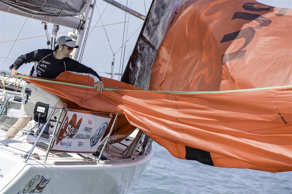 Conformément aux conditions annoncées la veille, les organisateurs de la Solo Maître CoQ ont dû composer, pour cette première journée de compétition, avec un vent faible de secteur Est-Sud-Est. Malgré cette météo marine capricieuse, le comité de course a réussi à lancer deux manches. Un premier parcours de 17,5 milles nautiques gagné par le britannique Alan Roberts (Vasco de Gama) à la barbe de Damien Cloarec (Saferail) – qui avait pourtant mené la danse depuis le départ – et Corentin Douguet (Sofinther – Un maillot pour la vie).