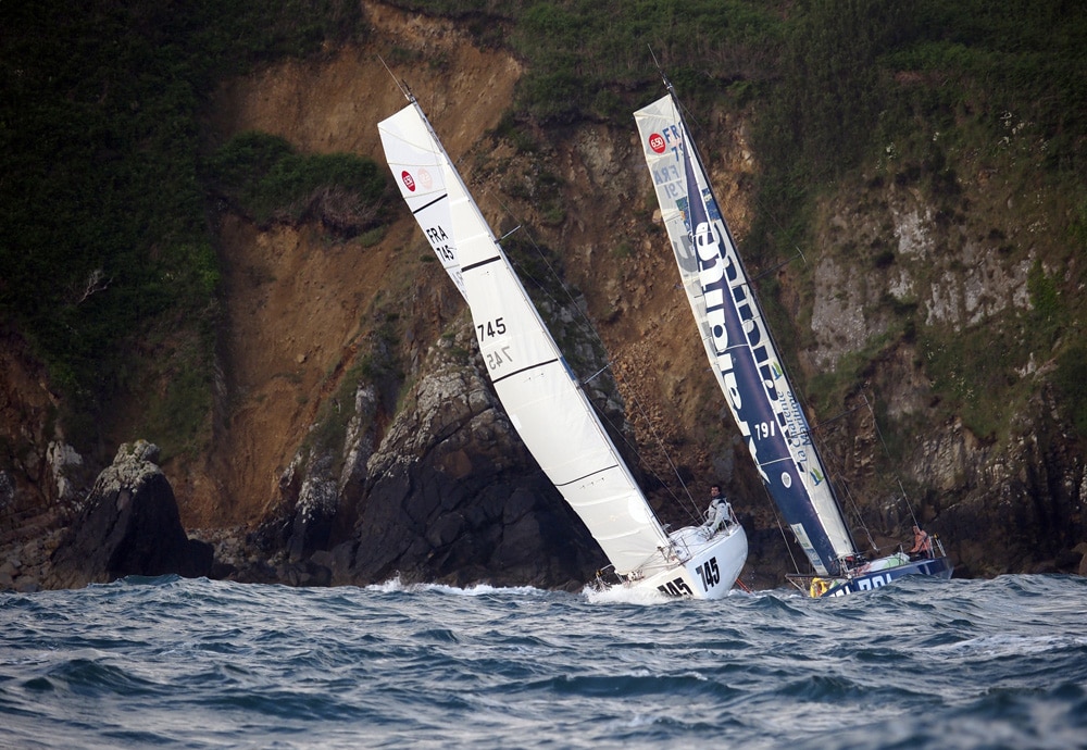 Ce matin, à Douarnenez comme sur la course, le soleil s’est levé du pied gauche, et il va pleuvoir toute la journée. Les Minis 6,50 se sont élancés hier soir à 19h10, après un rappel général dû à l’impétuosité des équipages et leur envie d’en découdre. Cette motivation n’a pas faibli et l’ensemble de la flotte franchissait le Chenal du Four, premier obstacle du parcours, avant le milieu de la nuit pour se lancer ensuite dans une traversée musclée de la Manche. Deux concurrents toutefois le 514 et le 550 -, tentés sans doute par des trajectoires trop tendues, ont talonné à hauteur des Pourceaux, vers la sortie de ce passage. A l’heure qu’il est, ils ont rejoint le port de Camaret-sur-Mer accompagnés par le bateau suiveur Altaïr, où ils pansent leurs plaies.