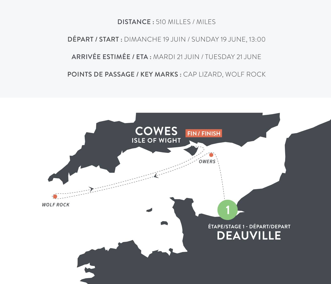 La première étape de la 47eme édition de La Solitaire Bompard Le Figaro, longue de 510 milles, s’annonce celle de tous les dangers. Sur ce parcours des plus exigeants entre Deauville et Cowes (Île de Wight) qui consiste en une traversée de La Manche, puis un aller et retour le long des côtes sud de l’Angleterre via le phare de Wolf Rock, les pièges seront nombreux. En plus des courants, cailloux, baies et caps, la météo va pimenter le jeu : du petit temps pour le départ, un front à passer la première nuit, puis du près, du près et encore du près dans un vent mollissant et capricieux jusqu’à la pointe extrême sud-ouest de l’Angleterre. Top départ demain à 13h02 !