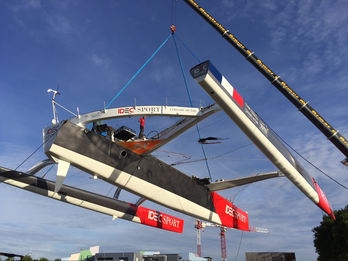 Ce lundi matin, IDEC SPORT a été remis à l’eau après un chantier intensif d’été mené par l’équipe de technique de Francis Joyon au chantier Multiplast, à Vannes. Ce retour sur l’élément liquide du trimaran de 31,50 mètres de long marque le début d’une nouvelle campagne dans l’objectif de décrocher le Trophée Jules Verne*. Difficile en effet d’oublier que l’année dernière le skipper trinitain et ses cinq hommes d’équipage avaient frôlé de peu l’exploit. Seuls une météo peu favorable et deux petits jours leur avaient manqué pour battre le record de vitesse absolue autour du monde. Ce n’est donc que partie remise pour Francis Joyon qui s’apprête à repartir sur le même bateau, dans la même configuration d’équipage réduit, dont la composition sera révélée dès la semaine prochaine.