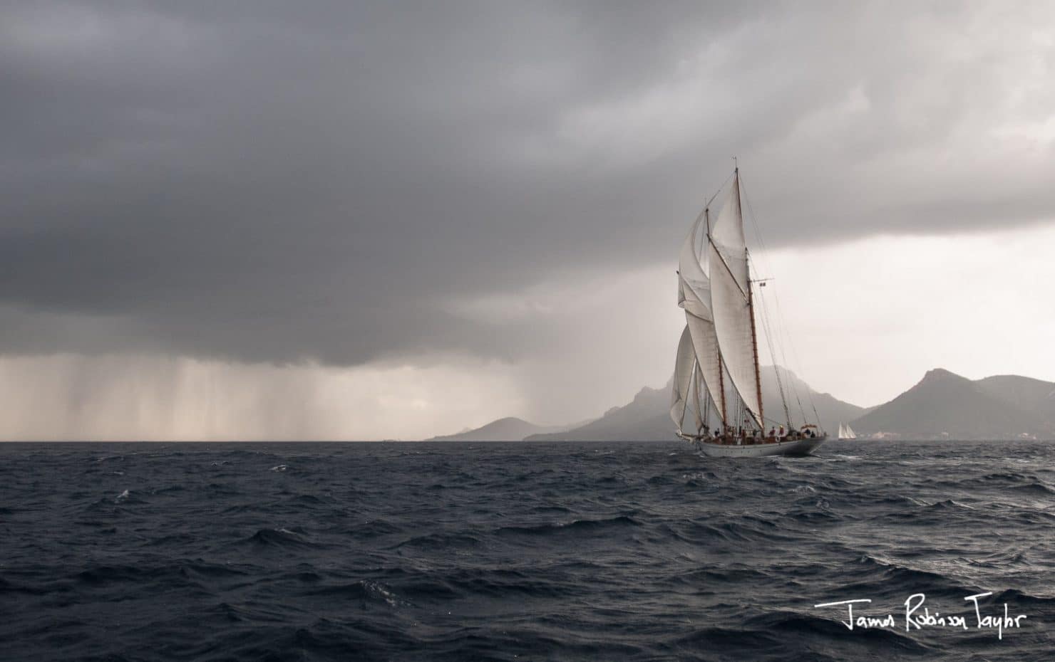 Tonnerre de Cannes ! Certes ce furent d’abord les coups de canon des départs qui ébranlèrent même les massifs de l’Estérel et du Tanneron, les préalpes de Castellane jusqu’au Mercantour, mais surtout les cumulonimbus qui s’accrochaient aux montagnes pour déverser leur trop plein de pluies et d’atomes. Une ambiance électrique donc pour cette deuxième journée des yachts classiques qui entraînait le démâtage de Cœur Vaillant, le 8mJI de Philippe Monnet, heureusement sans problème pour l’équipage. Un casse-tête pour les stratèges qui durent composer avec les bascules de vent et les risées catabatiques. Un round complexe qui mit dans le rouge les équipages en quête de la voilure la plus adaptée entre zone de calmes et grains subits…