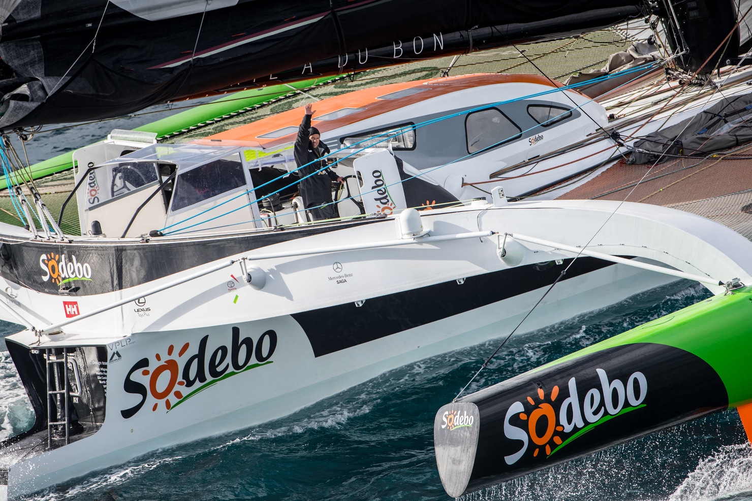 A 17h 57mn 30s ce 25 décembre 2016, Thomas Coville, seul à bord de son grand trimaran Sodebo Ultim’, a coupé la ligne d’arrivée des tours du monde en solitaire à la voile en multicoque située à six milles au large du phare du Créac’h à Ouessant (Finistère).