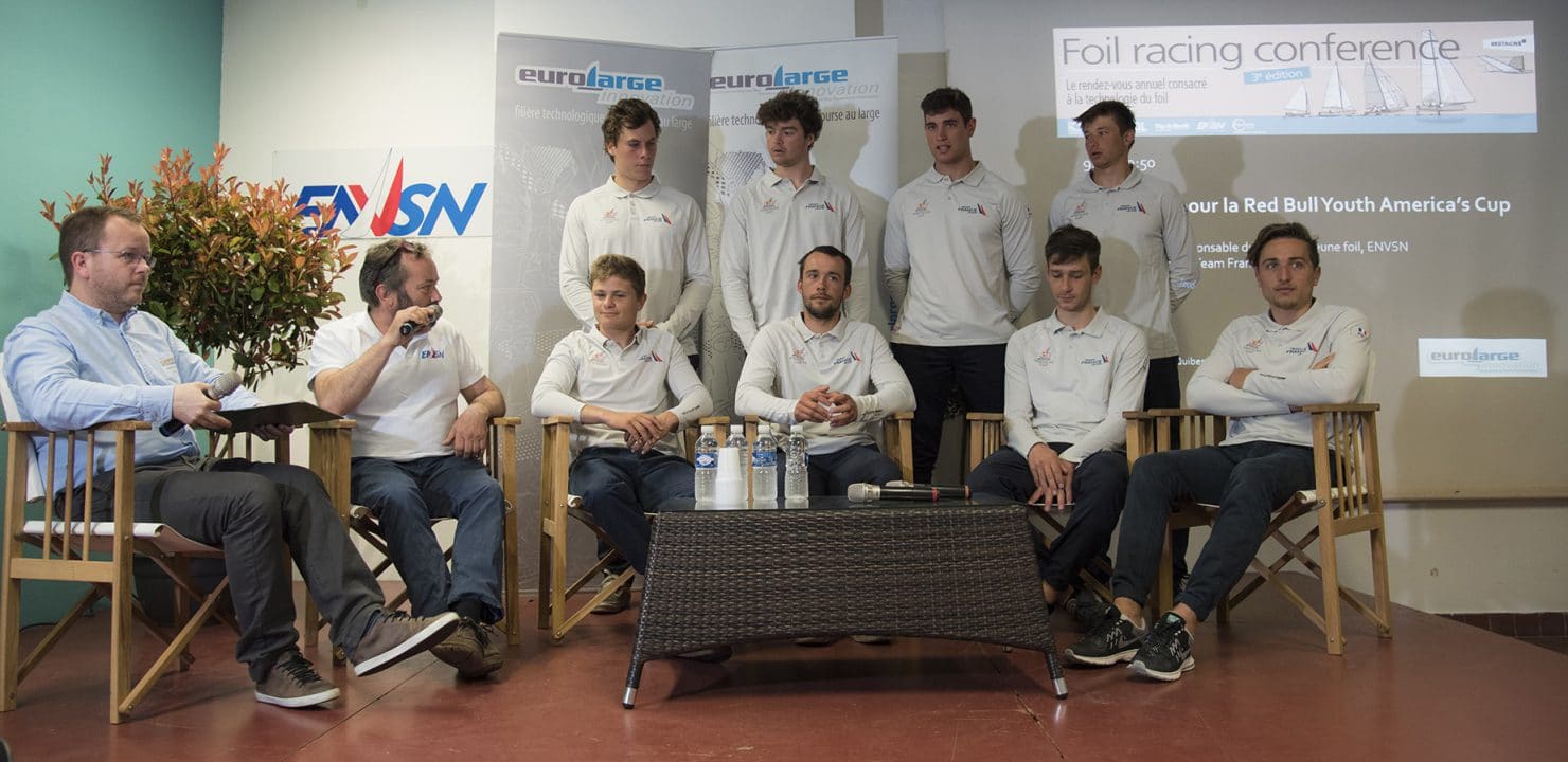 Jean-Yves Le Déroff, directeur de l’ENVSN, puis Thierry Verneuil, président du Conseil d’Administration ont prononcé un discours d’introduction, suivi de Jean-Claude Le Bleis, président d’Eurolarge Innovation. Le Team France Jeune, en route pour la Red Bull Youth America’s Cup, et qui s’entraîne à l’ENVSN, s’est présenté à l’assemblée. Puis, des grands noms de la voile française se sont succédés au micro de Pierre-Yves Lautrou, animateur de cette conférence. Les thèmes étaient riches et variés, évoquant la course au large et l’olympisme, la construction comme le sportif. Eurolarge Innovation avait également choisi de mettre en valeur le travail réalisé par l’ingénieur de recherche, Paul Iachkine, et de Yves Clouet, entraîneur du Team France Jeune pour l’ENVSN. Neilpryde, Kerfoils ou encore Horue sont également intervenus et exposent, par la même occasion, à La Semaine Affoilante®. Régulation des foils au large : l’asservissement est-il incontournable ? Telle était la question posée à Frédéric Monsonnec, membre du Team LSA, co-organisateur de La Semaine Affoilante®.