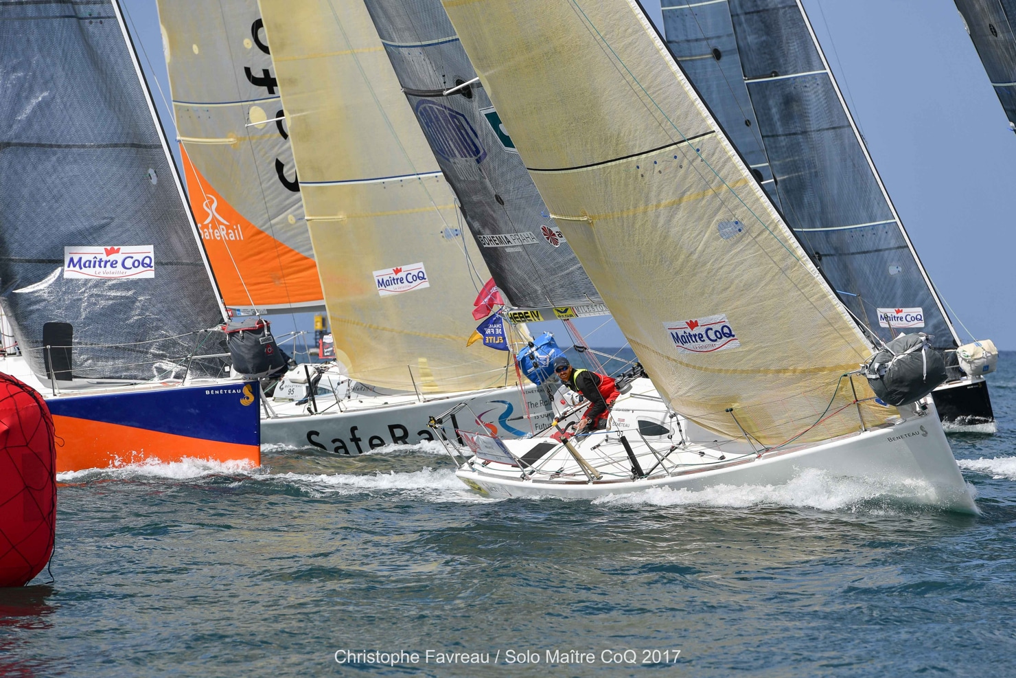 Le départ de la course n°4 de la Solo Maitre CoQ a été donné ce jeudi 27 avril à 12h en baie des Sables d’Olonne. Les 40 figaristes se sont élancés sans encombres sur le grand parcours de coefficient 3 dans un vent faible de 5 noeuds et oscillant entre 0° et 30°. A la bouée de dégagement, Nicolas Lunven, skipper de Generali, virait la marque en tête avant de partir sous spi vers l’île de Ré et d’être rattrapé par Martin Le Pape, skipper Macif 2017, au passage du pont de l’île de Ré. Très groupé, l’ensemble de la flotte a passé ce point stratégique en 15 minutes. Ils font maintenant route vers Belle-Île. Suite aux prévisions météorologiques instables pour la fin de parcours, ce denier a été modifié et réduit à 260 milles nautiques. Les premiers Figaros sont attendus sur la ligne d’arrivée samedi 29 avril au matin.