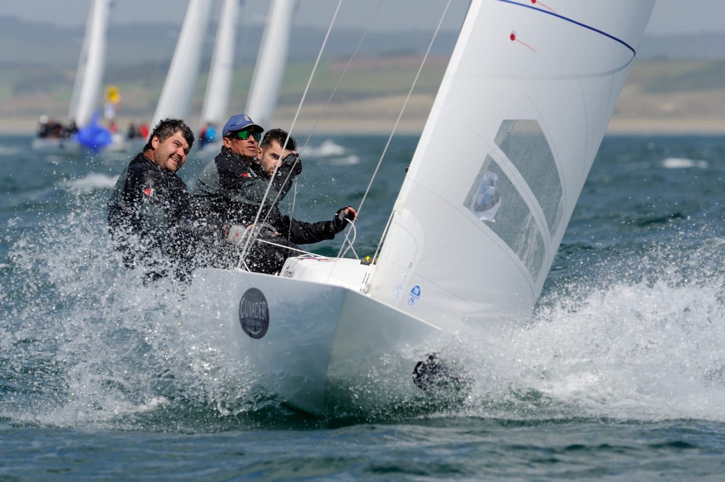 Jean Coadou officie en tant que président du Comité et a lancé sa première course à 14 h 05 dans un flux de 12 nœuds d’Ouest sur un parcours de 1,2 milles. Les favoris se sont immédiatement manifestés et même si la flotte est restée relativement groupée (il y avait 7 minutes entre le 1er et le dernier), les favoris ont d’emblée pris le dessus. Hoj-Jensen Poul Richard (GBR 813) s’est emparé de la plus haute marche du premier podium, suivi de Dmitry Samokhin (Rus 76), puis de Martin Payne (GBR 585). Le premier équipage français est celui de Gérard Blanc (FRA 409) qui se classe 10ème de la première course du jour.