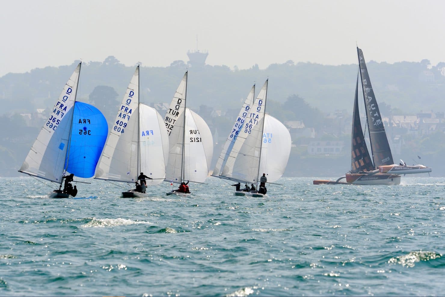 Les Dragon ont repris la mer pour leur deuxième jour de course du Grand Prix Guyader, tandis que les Multi50, arrivés hier dans la soirée au port de Tréboul, ont commencé les entrainements en baie. Au beau milieu de ces deux flottes que presqu’un siècle de différence d’âge contemple, naviguent, royaux, les mythiques Pen Duick. Et, pour ne rien gâcher, la météo s’est faite complice de ce spectacle magnifique !