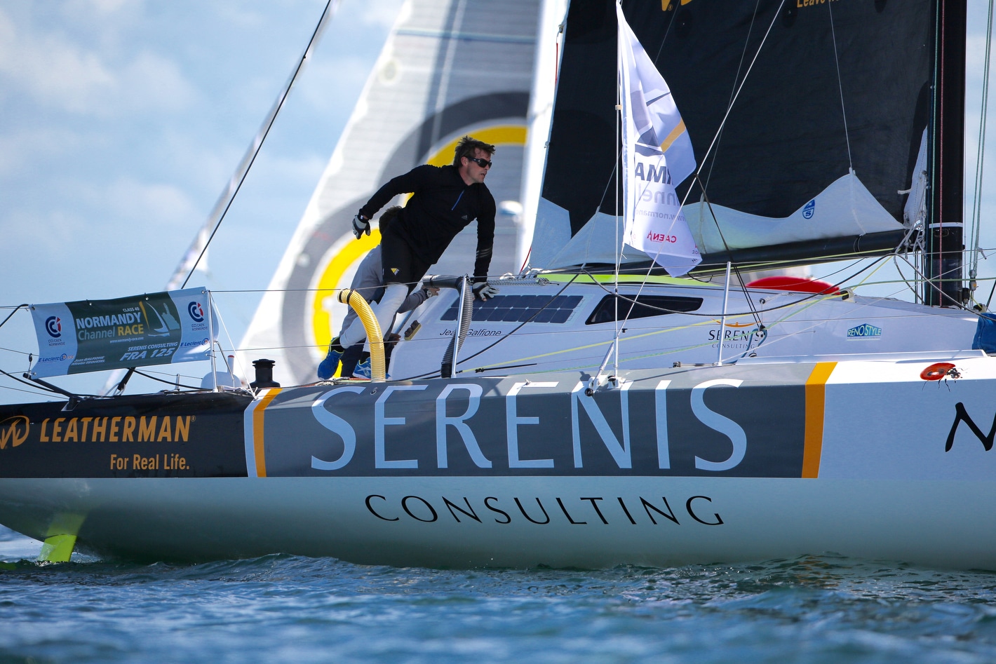 Manuel Cousin et Aloïs Kerduel n’auront pas ce plaisir. Leur Groupe Setin est de retour à Ouistreham, privé depuis les toutes premières heures de course de sa sous-barbe, cet ô combien important élément de soutien de son bout-dehors, rompu lors du parcours spectacle devant Hermanville. Ce sont les grandissimes favoris de cette 8ème édition de la Normandy Channel Race, le duo Britannico-Espagnol Phil Sharp-Pablo Santurde (Imerys) qui donnait hier soir l’impression de vouloir dès la traversée de la Manche frapper les esprits en s’emparant résolument du commandement lors du contournement des îles Saint Marcouf, première marque de passage de la course au large de la péninsule du Cotentin. C’était sans compter sans un autre ancien vainqueur de l’épreuve, Nicolas Troussel, associé cette année à bord de son ancien bateau à Jean Galfione, co-recordman des participations dans cette grande classique Normande avec Halvard Mabire (7). Leur Serenis Consulting a ravi au très British Imerys l’honneur d’entrer en tête dans le Solent, au terme d’une remarquable trajectoire en Manche. Nico et son champion Olympique de skipper ont imposé cette nuit leur rythme et leur belle trajectoire dans un superbe sprint aux allures portantes qui a déjà effectué un premier tri en tête de course en faveur des ténors de l’épreuve.