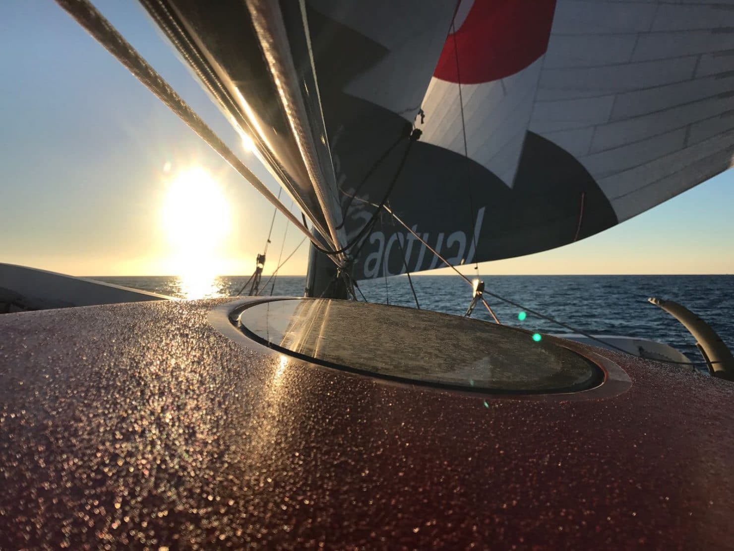 « On est au près, on monte tranquillement au Nord pour aller chercher la bascule de vent de la première dépression. C’est ambiance « saute-moutons » sous un ciel gris avec quelques grains qui passent. On devrait virer dans le milieu d’après-midi (HF). On va alors toucher un flux de Nord qui va se renforcer gentiment entre deux dépressions. On va avoir 24 heures un peu toniques au reaching avec une mer un peu croisée. Ça va être une partie un peu plus rapide, mais aussi plus délicate à gérer. On adorerait profiter des transitions pour revenir sur nos trois camarades de devant, mais en vitesse pure, cela restera dur. On va prendre ce qu’on peut prendre. On ne va rien lâcher jusqu’à l’arrivée. »