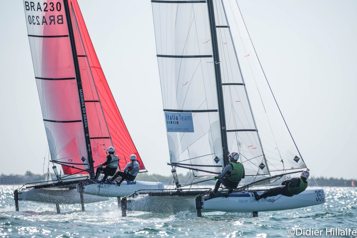 Il reste toutefois 9 manches pour entrer dans les 10 finalistes qui disputeront la medal race dimanche. L’affaire est donc loin d’être réglée pour les trois leaders actuels, talonné par les excellents Néo-zélandais Gemma Jones /Jason Saunders et par les Français Moana Vaireaux/Manon Audinet.