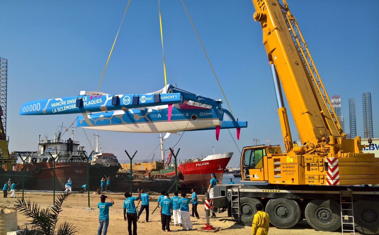 C’est fait ! Après neuf mois de chantier, le Multi50 Solidaires En Peloton – ARSEP a été mis à l’eau samedi 20 janvier à Dubaï. Thibaut Vauchel-Camus, navigateur malouin originaire de Guadeloupe, le chantier ENATA et le cabinet VPLP lancent ainsi dans l’arène océanique un trimaran unique pourvu de foils et dont l’objectif est double : performer sur les grandes courses à la voile, à commencer par la Route du Rhum – Destination Guadeloupe, départ le 4 novembre prochain, et vaincre ensemble la sclérose en plaques.
