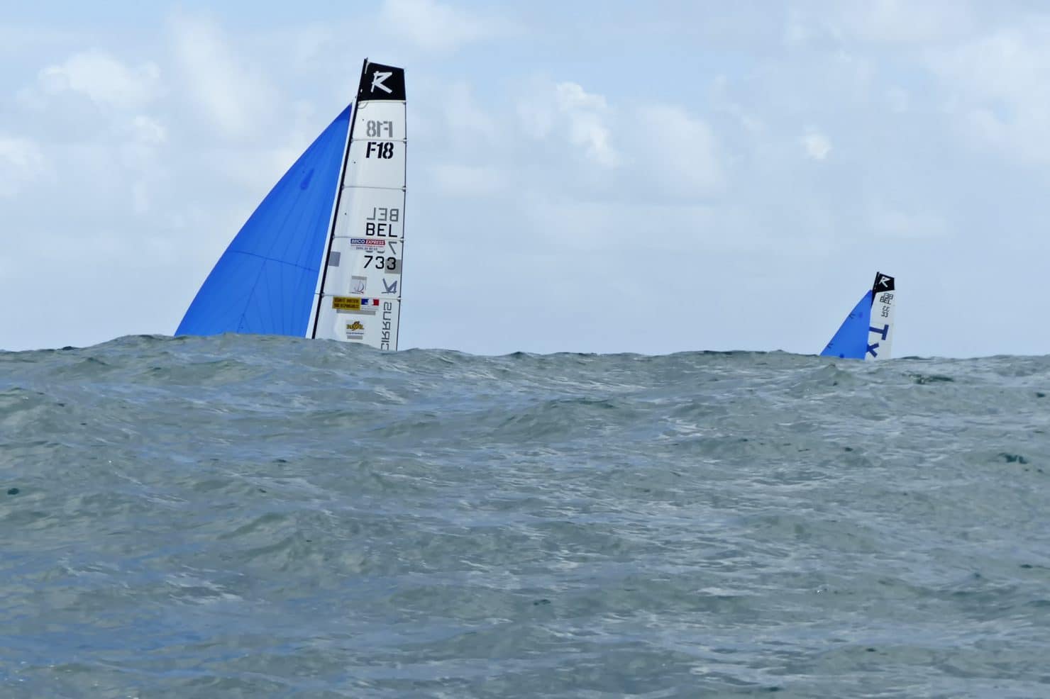 Cette partie de la course, sous le vent de la cote caraïbes a vu de nombreux changements de vent et de classement, avec en tête sur une bonne partie de ce parcours l’équipage CHAMPANHAC/DHALENNES, jusqu’à un regroupement des neuf premiers, qui avaient laché le reste de la flotte, Plusieurs leaders se sont succédés, dans un vent changeant…. Les frères Boulogne, sur une forte bascule de vent sous spi, ont même dessalé (chaviré) alors qu’ils venaient de prendre la tête. Peu après le vent se renforçait nettement et trois équipages ont pris les commandes: GFA Caraibes avec Nicolas GILLET/Nicolas POIX, Emmanuel et Vincent BOULOGNE, et Stéphane KIEFFER et Olivier LECOMTE, dans cet ordre à la marque devant Schoelcher. L’entrée de la baie de Fort de France se faisait au près, dans un vent de 20 noeuds avant l’arrivé d’un grain violent avec près de 30 noeuds et une forte pluie rendant la visibilité très faible.