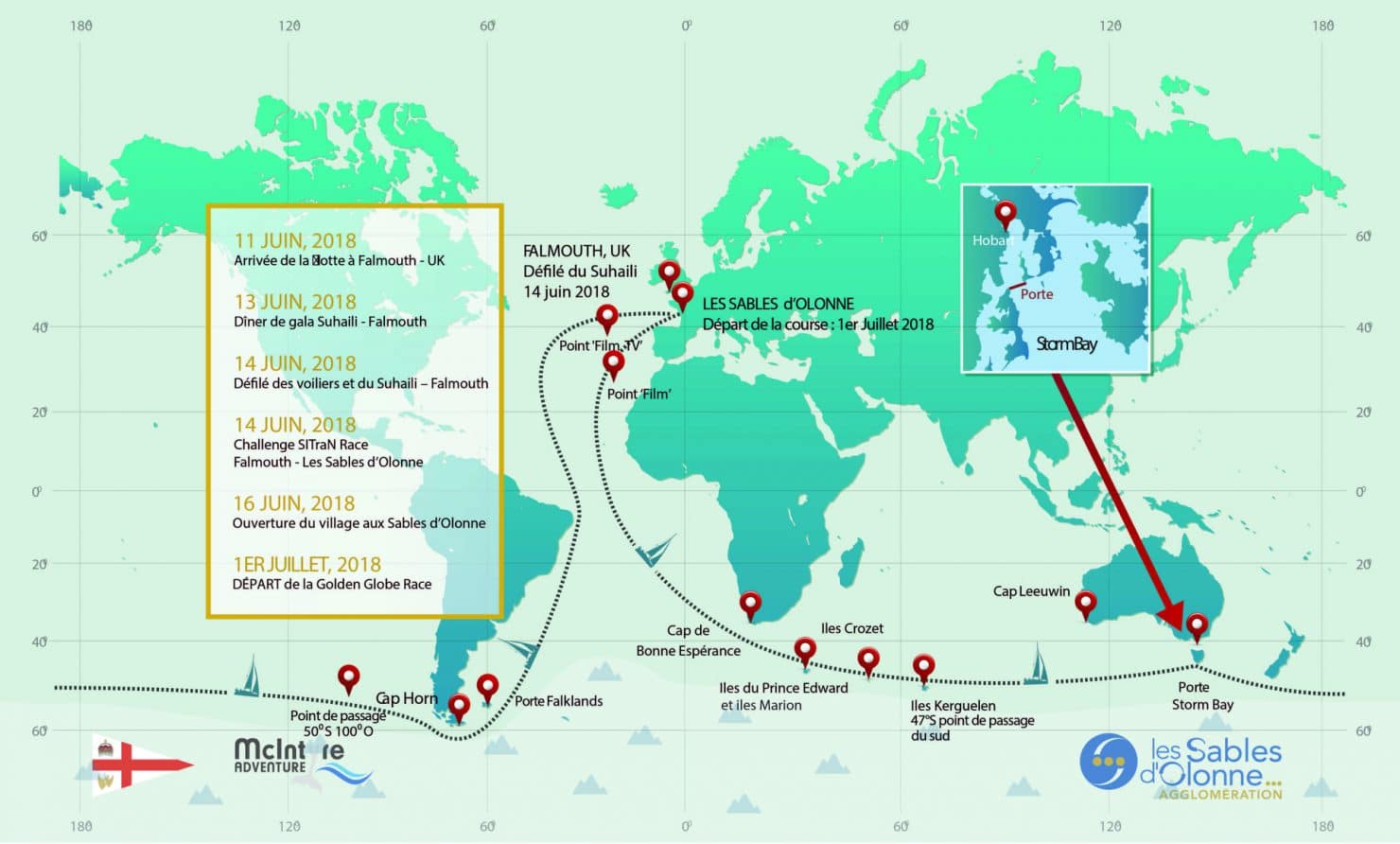 Le premier port d’escale pour les 20 participants sera Falmouth, Royaume Uni, entre le 11 et le 14 juin 2018, pour la “ Suhaili 50 Falmouth Parade of Sail ” célébrant le 50e anniversaire du départ de Sir Robin Knox-Johnston en 1968 au départ du Sunday Times Golden Globe.