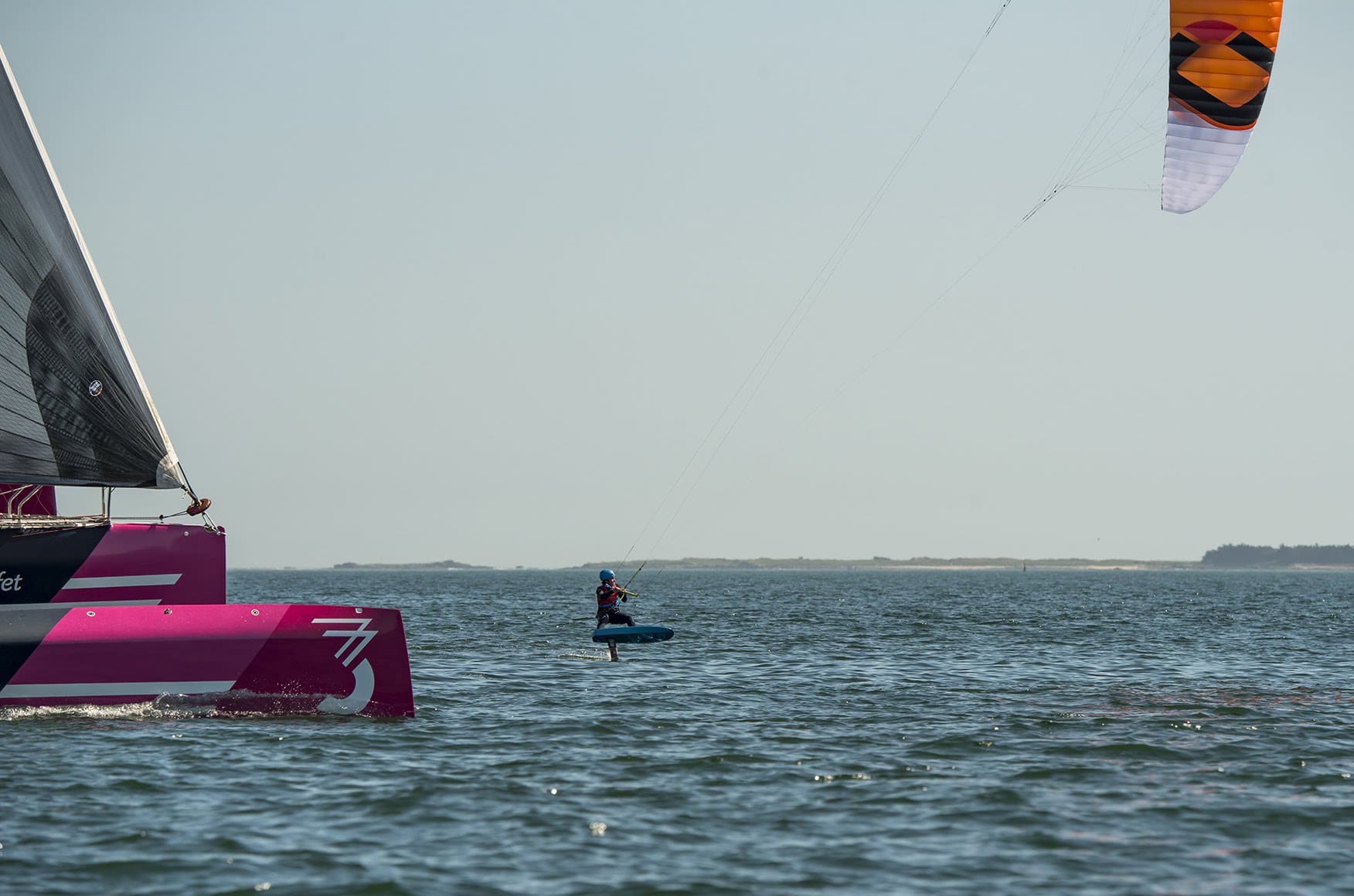 Majestueux, le Multi 50 Fenêtréa – Mix Buffet d’Erwan le Roux a traversé la baie de Quiberon depuis son port d’attache, la Trinité-sur-Mer, pour participer au Défi Multi 50 qui marquait l’ouverture de la quatrième édition de l’événement foil de l’ENVSN. Erwan le Roux et son équipage composé de copains se sont mesurés sur plusieurs runs de vitesse à différents supports, bien évidemment tous volants. Pour se mesurer à ce géant des mers lors de ce défi totalement inédit, les coureurs de la baie de Quiberon avaient eux aussi répondu présents: Delphine et Alexandre Cousin en windfoil, Malo Quernec en kitefoil, Julien Villion en Moth, Solune Robert et Charles Dorange en Flying Phantom Elite ainsi que Jessee Besson accompagné de Jean-Yves le Deroff en Flying Phantom Essentiel. Le directeur de l’ENVSN et champion olympique de Tornado à Séoul 1988 a profité de l’occasion pour enfiler la combinaison et reprendre ses réflexes d’expert du multicoques.