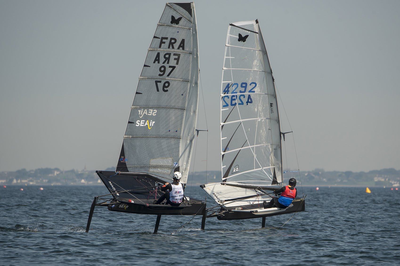 Les conditions ont été idéales pour les essais mais également pour le National Moth qui a lancé quatre manches. Hugo Feydit, Fernando Lodos et Mateo Lavauzelle constituent le podium provisoire. Ravis de leur journée, les coureurs sur leurs engins volants ont croisé les windfoilers et les kitefoilers sur le plan d’eau. Les Championnats de Bretagne se sont déroulés à merveille avec sans surprise la première place d’Alexandre Cousin en windfoil, devant William Huppert et Kevin Festocq après deux manches. Les kitefoils ont tiré le maximum de la météo, Kieran le Borgne prend la tête devant Malo Quernec et Tino Deshoux après une belle série de six manches de haut vol.