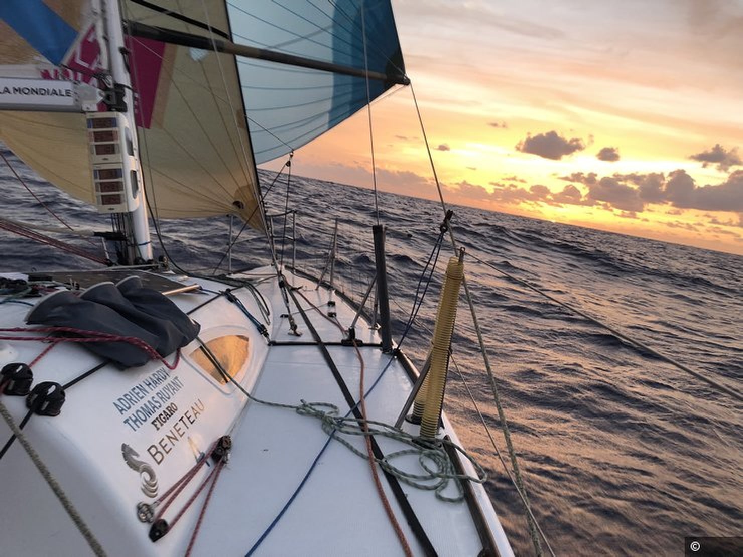 « Nous avons eu une nuit un petit peu bizarre : il y avait pas mal de vent, la mer était désordonnée mais ça avançait bien. C’est un peu tôt pour dire si notre position est bonne. Ça va être assez serré : on en saura plus dans trois jours et la hiérarchie ne sera pas loin d’être établie. Tout le monde va continuer sur ce bord, après on verra ce qui se passe dans quelques heures. Nous avons un point d’empannage situé dans le Nord qui est un peu le même pour tout le monde. Breizh Cola s’est un peu écarté de nous cette nuit où nous avons eu pas mal de vent, jusqu’à 30 nœuds. C’est un alizé un peu plus fort mais il n’est pas stable, il varie énormément en direction et en force. On a des journées qui sont un peu plus longues que d’autres et il commence à faire très chaud à la barre. Nos quarts sont très variables, cela dépend de ce qu’on a à faire sur le bateau, de la météo et de la pêche du jour car il y a des poissons-volants. Comme c’est Pierre qui est préposé à la cuisine, et bien moi je barre. Nous n’avons pas pris assez de citron mais nous avons de l’huile d’olive et on assaisonne nos poissons avec. Le midi, il fait très chaud, c’est dur, et les débuts de nuit sont compliqués car la lune se lève tard donc il fait très noir. »