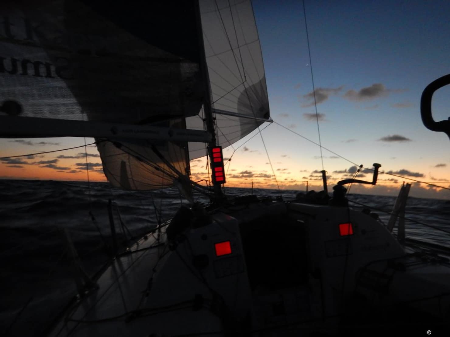 « Nous n’avons pas fait une bonne nuit mais nous sommes à fond. On regarde ce qui s’est passé dans le Nord. On a eu un souci technique hier qu’on a réparé depuis mais qui nous a bien pesés : on a perdu notre perche à algues et comme on vit dans un océan rempli de sargasses, c’est vite un gros problème ! On va voir ce que ça va faire quand les autres vont empanner. Ils seront en route directe… »