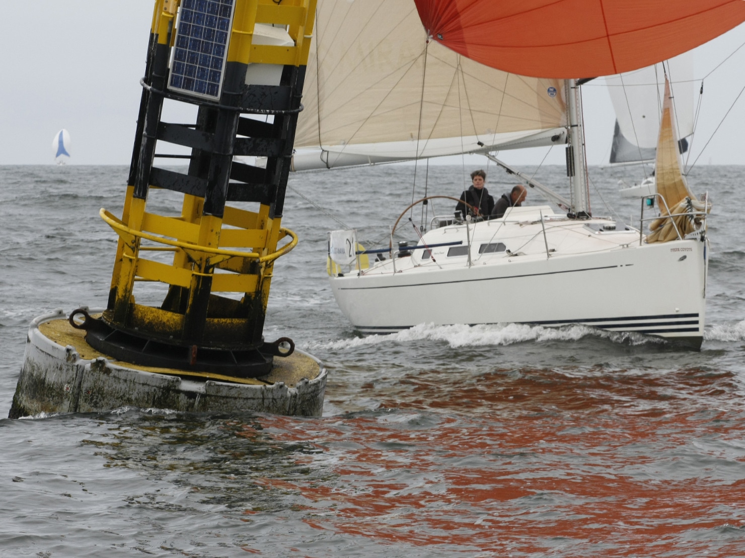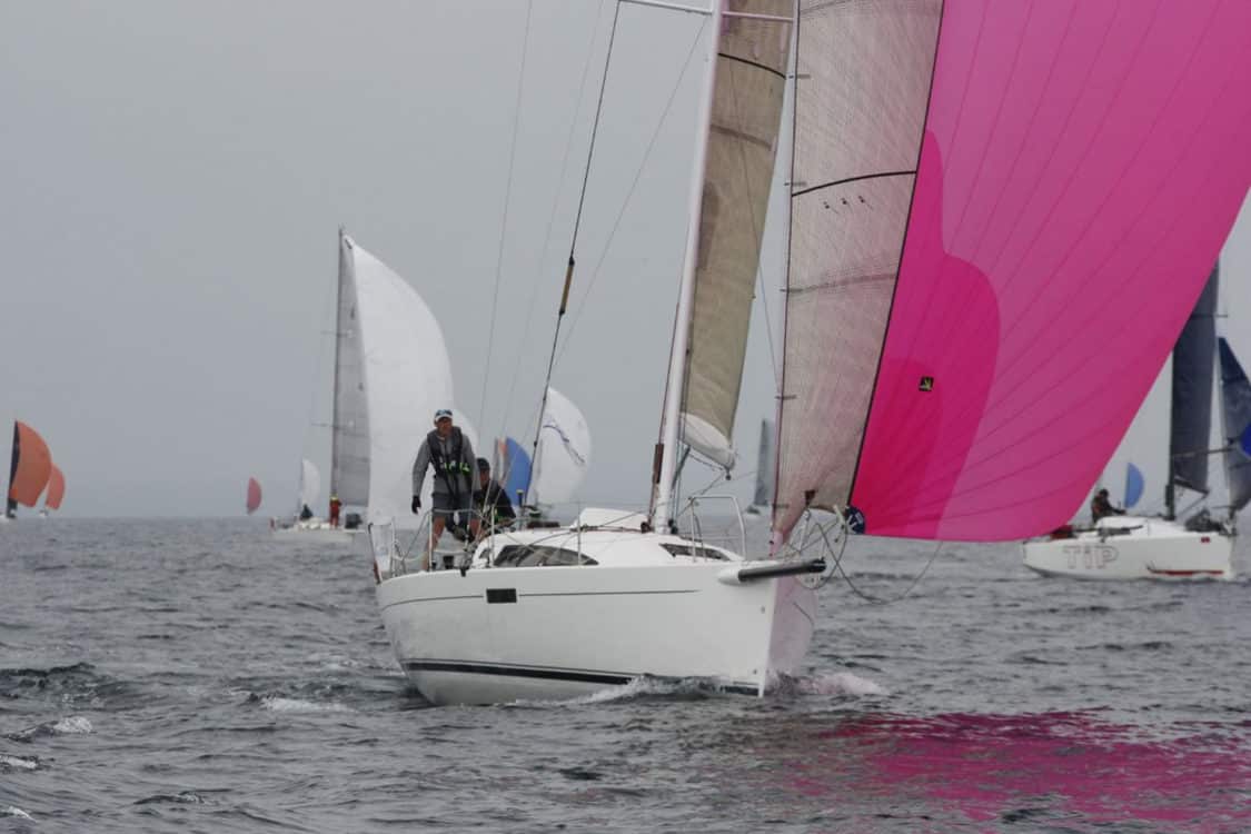 La troisième journée de la Duo Cat Amania 2018 entre Pornic et Port Joinville sur l’île d’Yeu s’est déroulée dans un tout petit temps et sous un magnifique soleil. Le Président du Comité de Course, Gilles Bricout, n’a pu lancer la manche qu’à 15h00 après avoir laissé les 40 bateaux se faire porter par le courant depuis le début de la journée. Ce seront finalement 14 milles que les duos auront parcourus dans 5 à 7 nœuds de vent, dont 10 milles sous spi.