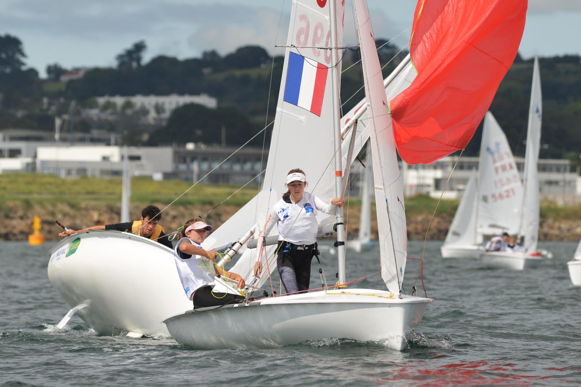« Nous naviguons ensemble depuis maintenant 4 ans et nous avons tous les deux 18 ans. On est du même club, à l’USAM donc c’est bien, on connait le plan d’eau et on est content d’être ici. On a eu quand même quelques surprises aujourd’hui, on ne savait pas trop de quel côté arrivait le vent. À la 1ère course ça passe à gauche et sur la suivante nous pensions que ça arriverait de la droite alors que c’est arrivé de la gauche sur le 1er bord et à droite sur le 2ème bord ! Naviguer ici en rade de Brest à l’année ça aide un peu mais finalement, la rade n’est pas si compliquée que ça ! On est un équipage qui est plutôt « lourd » donc lorsqu’il y a du clapot ce n’est pas forcément un avantage pour nous. Aujourd’hui c’était bien, nous sommes habitués à ces conditions avec peu d’air donc on aime bien. On s’est fixé comme objectif de finir dans les 8 pour être sûrs d’être en demi-finales et ce qui serait vraiment top c’est d’être dans les 2 pour jouer la médaille ! »