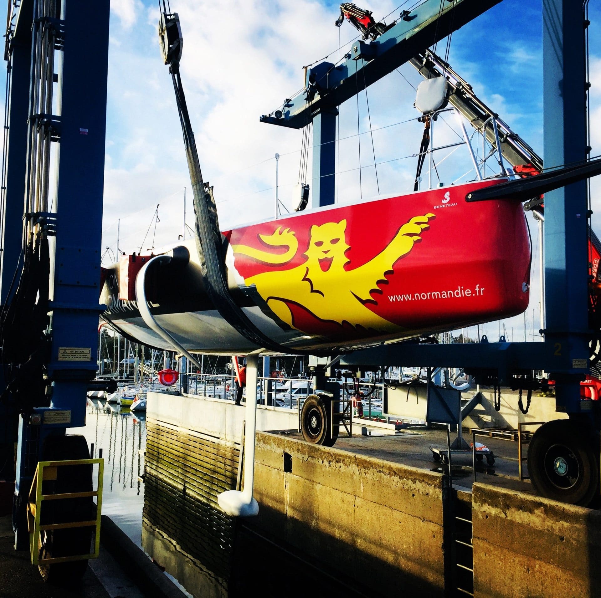 « Au début, après le déballage du bateau, nous avons réalisé un premier état des lieux et, comme l’autorise la classe, nous avons retravaillé différents points, comme par exemple la quille, dans le but de lui donner un plus joli profil. Nous avons également fait beaucoup de montage et de matelotage, puis nous avons soigné l’installation du système de foil. Au final, nous nous en sommes bien sortis et nous avons fait un truc propre. Après cette période de dix jours, nous avons mis le bateau sur un camion pour le descendre en Bretagne en passant par le Conseil Régional de Normandie. Là a eu lieu la cérémonie de baptême du Figaro III en présence d’Hervé Morin, Président de la Région. Ce moment restera évidemment un joli souvenir dans la vie du bateau et du projet. Dans la foulée, le camion a repris la route pour Port-la-Forêt où il est arrivé mardi matin. Très vite, tout s’est enchaîné : nous avons mis à l’eau mercredi puis mâté hier (jeudi). Les voiles sont prêtes et je dois les récupérer ce vendredi soir avant d’attaquer les premières navigations. »