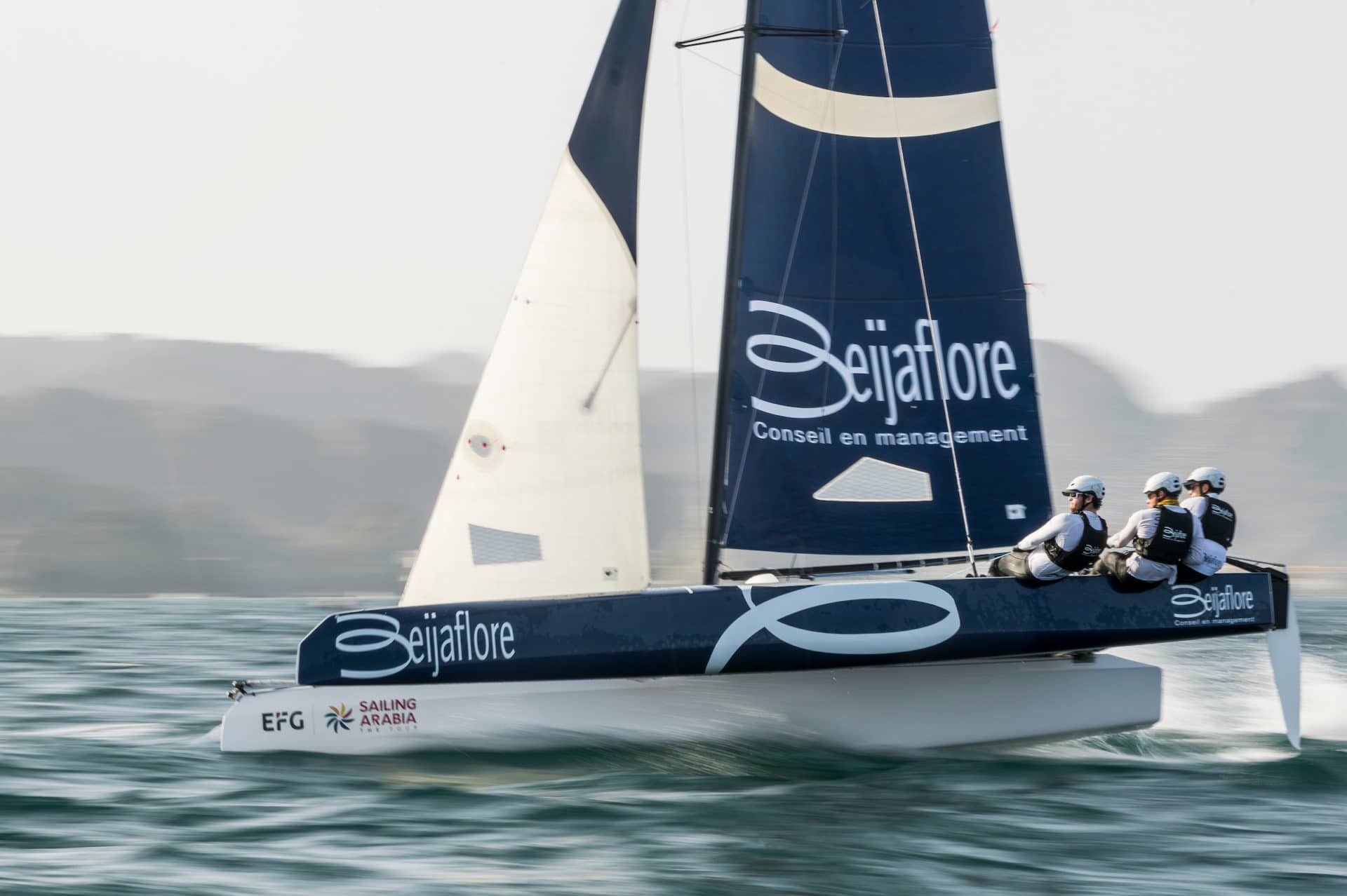 « Je suis content de l’étape, je suis content de la journée et tout le monde l’est aussi » savoure Bellet. « Arnaud Jarlegan nous apporte beaucoup en termes de réglages, de vitesse à bord, Valentin (Sipan, ndlr) a retrouvé sa tactique habituelle sur cette étape, et Guillaume (Pirouelle, ndr) retrouve ses repères à la barre » ajoute-t-il. « Ça n’est pas un sans-fautes, il y a des choses à améliorer mais tous nos adversaires ont eu des passages à vide » analyse le skipper. Cette remontée spectaculaire résume pourtant mal la confrontation de tous les instants sur le plan d’eau, notamment avec Stevie Morrison (Oman Shipping Company).