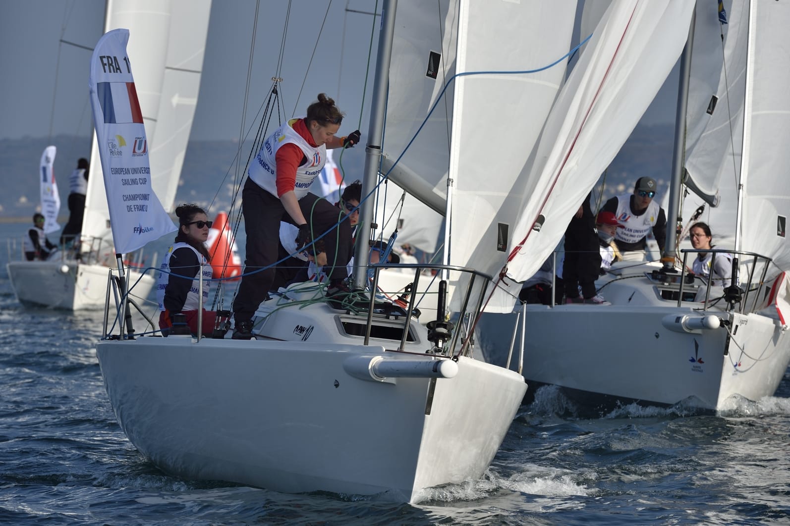 Il aura fallu beaucoup de patience pour les étudiants Français, Suisses, Allemands et Italiens des 18 équipages présents avant de pouvoir commencer à naviguer sous le soleil Cherbourgeois ! Après un briefing matinal, il fallait user d’imagination pour occuper son temps dans l’attente du premier signal de course qui n’est arrivé qu’en début d’après-midi avec une petite brise à 5 noeuds…