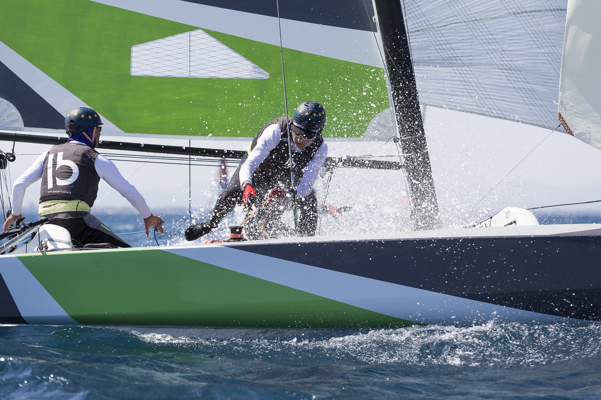 Superbe spectacle ce mardi à Port Barcarès pour le Raid Côtier de l’Acte 5, disputé dans des conditions idéales. Au terme du parcours de 40 milles, l’équipage de Golfe du Morbihan Breizh Cola (Solune Robert, Louis Flament, Charles Dorange) s’est imposé et a parfaitement réagi après sa violente collision survenue dimanche aux Sables d’Olonne. Derrière, les filles de La Boulangère (Mathilde Géron, Louise Acker, Amélie Riou) ont aussi réalisé une très jolie performance, décrochant la 2e place devant Team Beijafore (skipper : Valentin Bellet) qui reste leader du Classement Général. Rendez-vous demain à partir de 11h30 pour les Stades Nautiques de Port Barcarès.