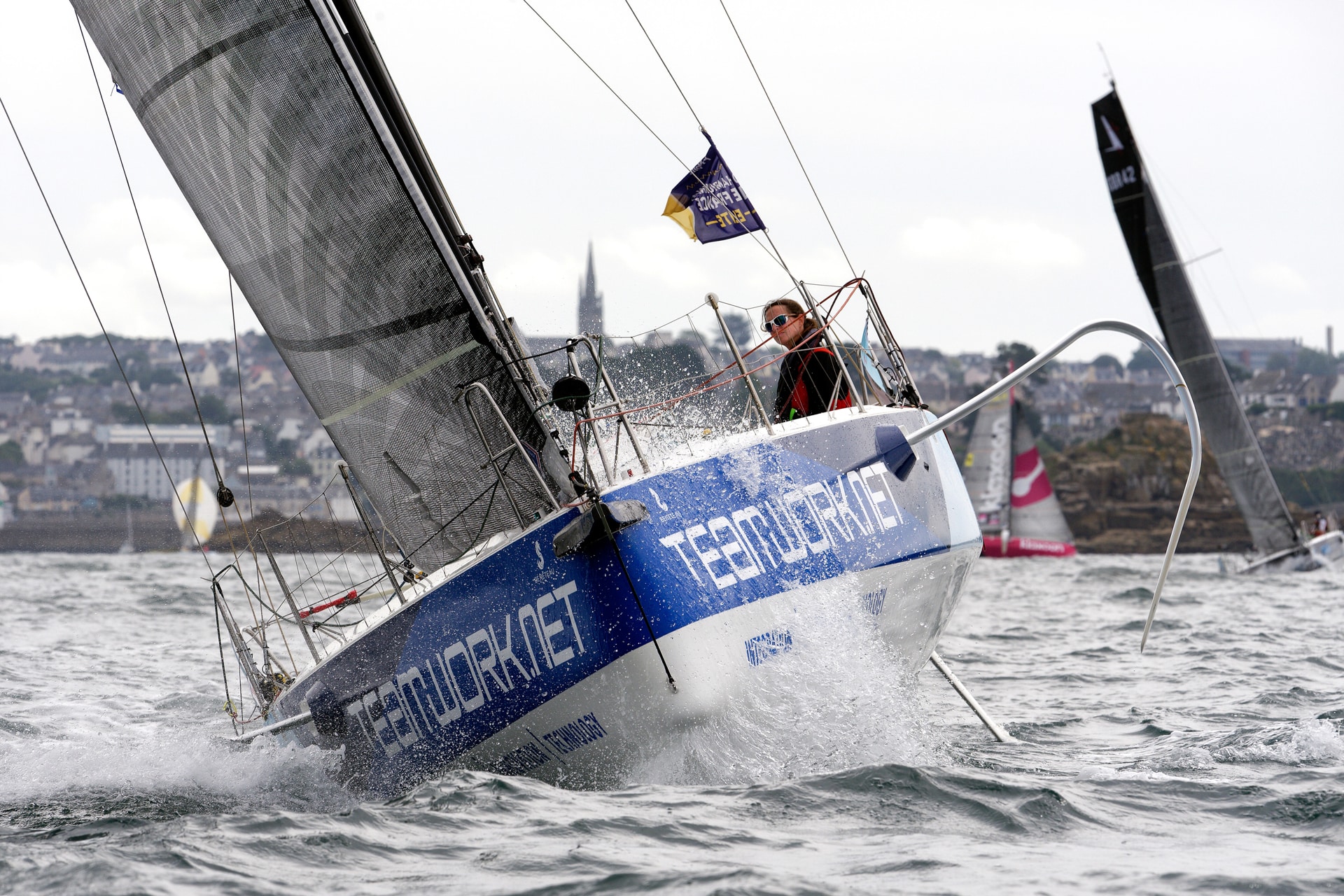 Mais avant de se triturer les neurones, les solitaires ont déjà eu fort à faire pour s’extirper du fond de la baie de Douarnenez. Avec une bouée de dégagement à virer, puis une bouée spectacle devant l’entrée du port de Tréboul, le parcours côtier permettait d’apprécier les options tactiques des uns et des autres. En bon régatier, Pierre Le Boucher (Guyot Environnement) privilégiait le bord à terre afin de bénéficier des effets de site à la pointe de Leydé. Bien lui en prenait, puisqu’il enroulait la bouée de dégagement largement en tête, devant Martin Le Pape (Skipper Macif 2017) partisan de la même option, mais moins radical et Tanguy Le Turquais (Quéguiner Kayak) qui s’était judicieusement replacé du bon côté du plan d’eau après un départ moyen.