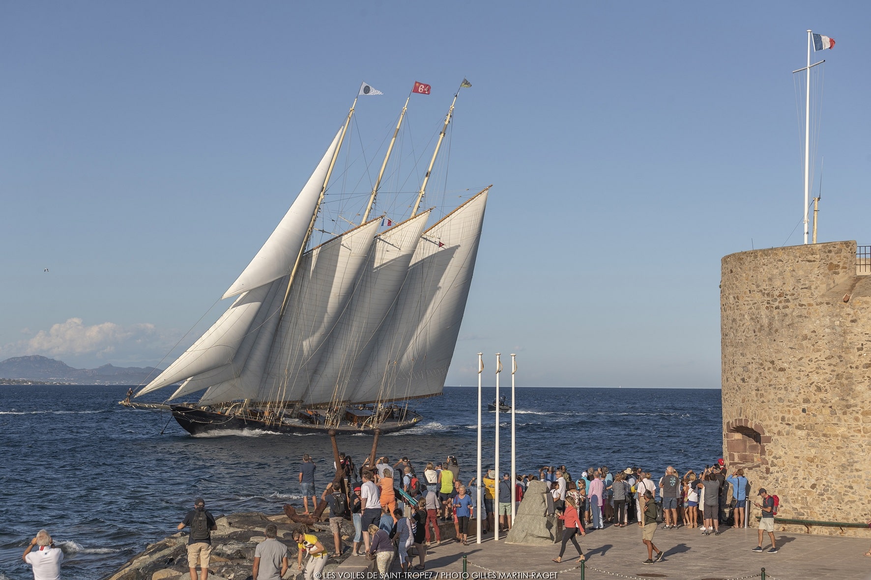 Présente dans le golfe toute la semaine, l’immense goélette a mêlé ses trois mâts et ses immenses voilures aux voiliers en course. Atlantic a été détentrice durant près de 75 ans du record de la traversée de l’Atlantique. Skippée par l’américain Charlie Barr, avec 50 hommes d’équipage, la goélette franche à trois mâts est entrée dans la légende en 1905, en traversant l’Atlantique Nord dans le cadre de la Kayzer’s Cup en 12 jours, 4 heures, 1 minute et 19 secondes, à une moyenne de 14,1 nœuds. Elle devait conserver ce record durant 75 ans. Sa fidèle réplique est venue ce soir, toutes voiles dehors et à toute allure saluer d’un long coup de corne les participants aux Voiles en train de s’amarrer à l’issue d’une belle journée de course. Tous les concurrents ont répondu à leur tour, créant une joyeuse et amicale symphonie de klaxon dans le port, prélude à une dernière soirée festive pour tous les équipages.