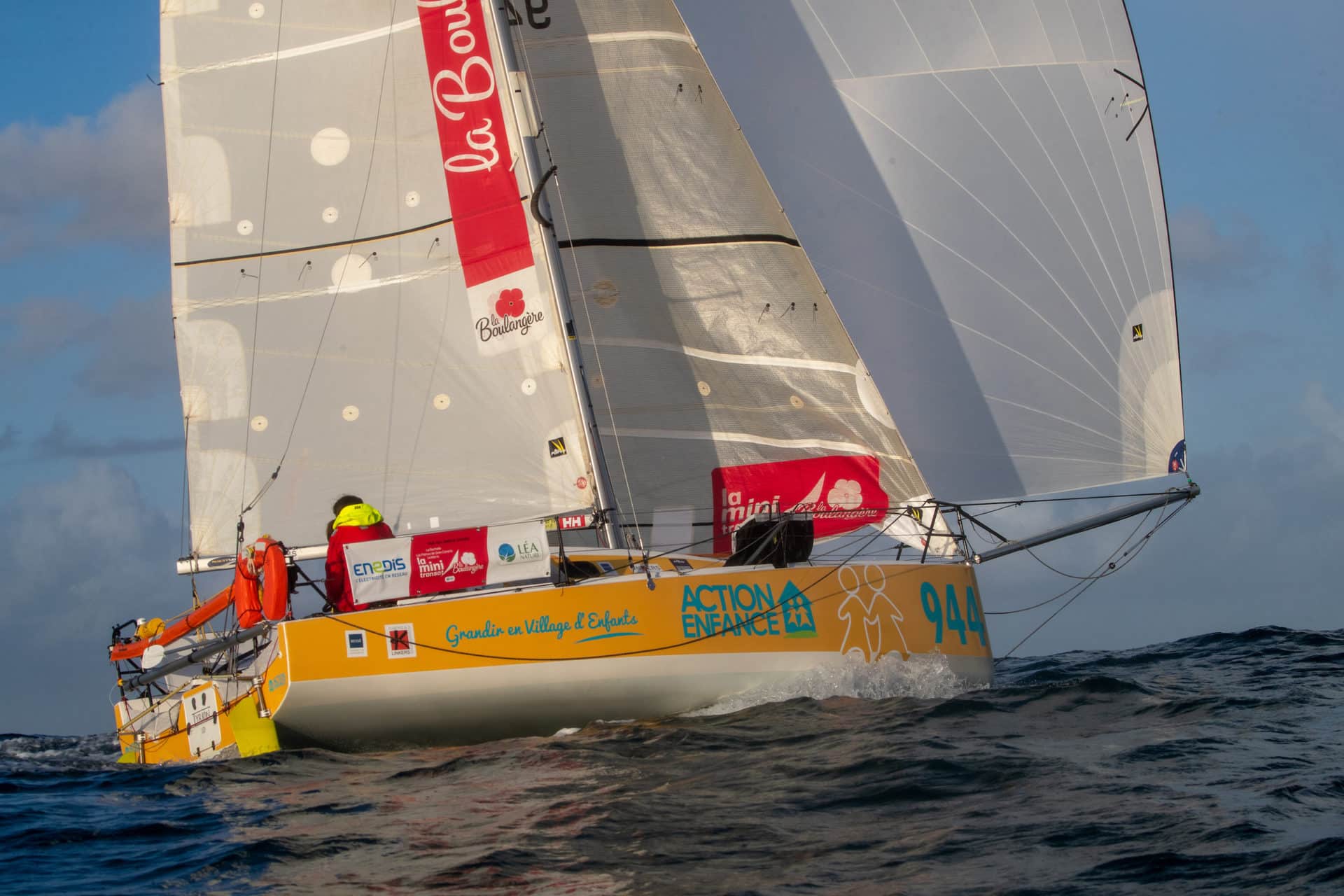 La seconde étape de la Mini-Transat La Boulangère est synonyme d’allure portante dans les Alizés, de la sortie de l’archipel des Canaries jusqu’aux portes des Antilles. Des conditions que Tanguy Bouroullec et son Proto foileur 969 – Cerfrance affectionnent forcement. La preuve en est que depuis la nuit dernière il fait parler la puissance de sa monture en ne lâchant plus la première place. Avec une vitesse moyenne de 12 nœuds sur les quatre dernières heures, le marin de Gouesnach creuse l’écart sur les poursuivants avec au pointage de 17h (heure française) 7,3 milles d’avance. Derrière, seuls Erwan Le Mene (800 – Rousseau Clôtures), Axel Trehin (945 – Project Rescue Ocean), François Jambou (865 – Team BFR Marée Haute Jaune) et Matteo Sericano (888 – Eight Cube) tiennent la cadence avec des vitesses moyennes entre 11 et 12 nœuds.