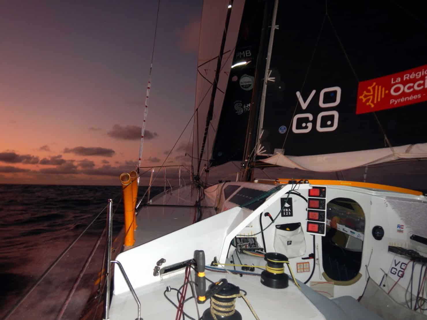 « Ça se passe bien, la mer s’est calmée, c’est plus vivable qu’hier. On va tout droit vers le Pot-au-noir, on voit des gros nuages arriver pour la fin de la matinée… Là on a 20 nœuds de vent, on est bâbord amûres sous spi medium avec un ris dans la grande voile, ça déroule toujours bien. La mer était grosse et un peu courte hier, c’était dur de vivre à bord, dur de se déplacer. C’est plus facile de naviguer quand on est devant, on a plus de temps pour les manœuvres, on agît sans précipitation. On a le temps de prendre les bonnes décisions, il faudrait faire cela tout le temps mais c’est plus facile quand on est devant ! J’espère que l’on n’aura pas le même scénario que Charal, on n’a pas envie qu’il se passe la même chose pour nous demain ! C’est ma première dans le Pot-au-noir, ça va être rigolo mais je n’aime pas les orages trop forts donc… Et là ça a l’air bien gros… Notre objectif c’est de rentrer dedans et d’en sortir le plus vite possible ! On ne voit qu’un gros nuage de 500 milles à traverser, je ne vois pas trop de stratégie… La fatigue se fait sentir, c’est obligé, mais ça pourrait être pire, les conditions sont quand même cool à part les premières 24 heures. Hier, on a croisé des Mini, on a discuté avec eux, c’était sympa, on s’est remémoré des anecdotes de notre époque avec Adrien ! C’est mon ancien bateau en tête, ça ne m’étonne pas, c’est vraiment un bateau incroyable ! »