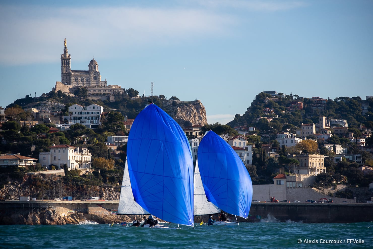 Qui a dit que les jeunes ne pouvaient pas se lever tôt? Avec une mise à disposition programmée à 9h du matin il fallait avoir du courage pour vaincre la fraîcheur de l’automne et entamer enfin le dernier Championnat de France Espoirs de l’année! Les 10 équipages en lice avaient hâte de prendre en main les J70 mis à disposition par la Ligue Sud de Voile. Malgré un vent faible on a assisté à de très beaux duels aux pieds de la « Bonne Mère » et a mi-chemin du Round Robin les équipages peuvent commencer à faire les calcul pour savoir si oui ou non ils pourront passer en phase finale.