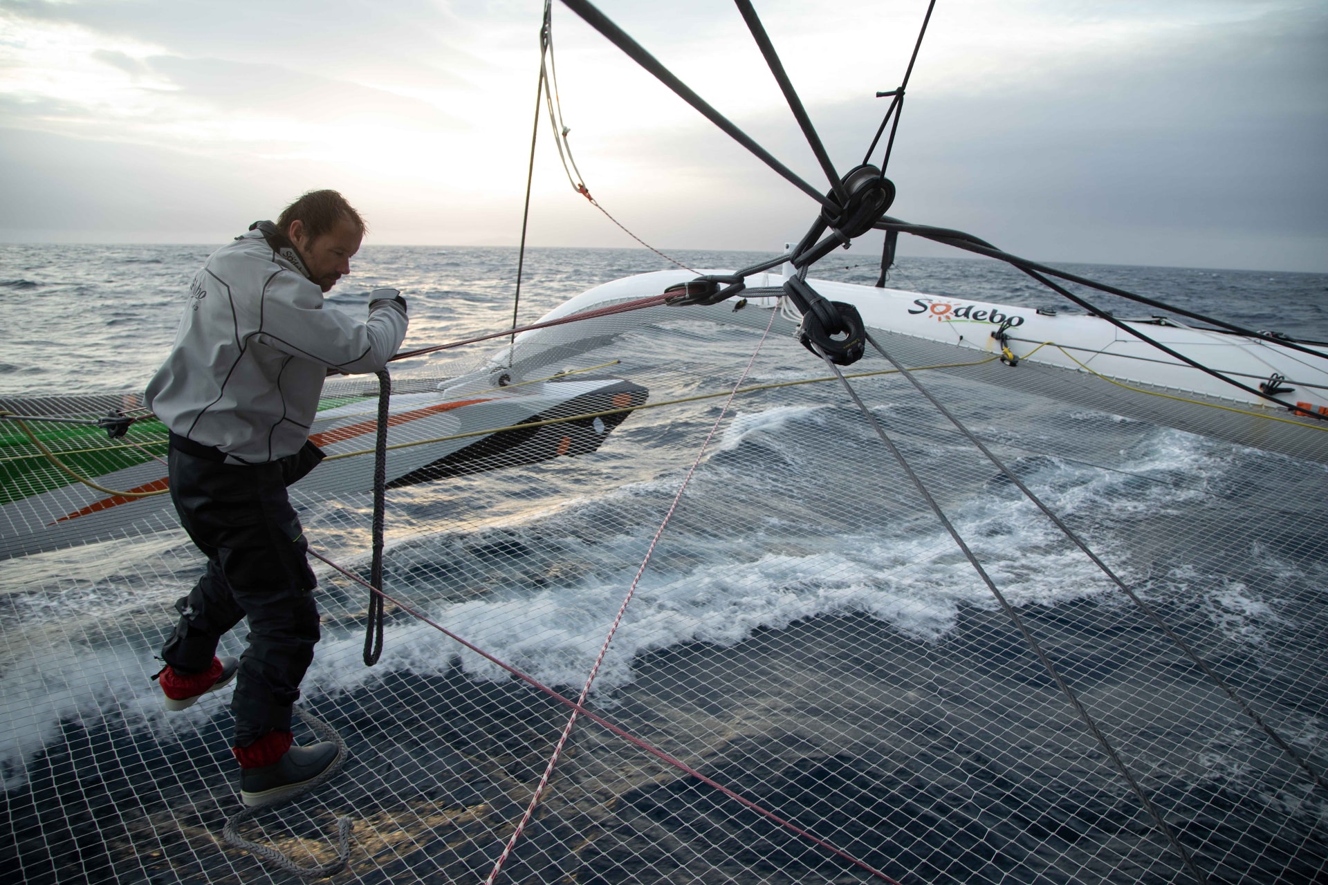 Un fait, une suite de mésaventures, une corrélation d’évènement gérés par Thomas et Jean-Luc. Ces hommes-là ont passé la journée du 18 Novembre sur le pont, pour sécuriser la situation, éviter le suraccident. L’ambiance grand Sud était au rendez-vous, lumière grise, un ciel plombé sillonné d’une multitude d’oiseaux, 20 – 25 noeuds d’un vent froid venant clôturer la carte postale. Dans ces conditions, il a fallu jouer les équilibristes sur le flotteur sous le vent afin de détacher le safran pour éviter qu’il continue d’endommager le fond de coque. Une fois cette tâche accomplie après plusieurs minutes à faire du rodéo, nous voilà repartis mais très vite la partie arrière du flotteur se dégrade à vue d’œil, la mer venant s’engouffrer dans le trou ou logeait la tête de safran. Les deux marins du bord réagissent et pensent à sécuriser le gréement si un de ses points d’ancrage venait à être fragilisé par la suite. Le relais s’effectue rapidement avec la cellule de routage à terre et l’opération peut commencer. Pour ma part, je suis là, attentif et spectateur de cette scène, ce duo, même dans des situations comme celle-là, fait preuve d’un calme et d’un grand sens marin. Thomas doit à nouveau revêtir le baudrier pour monter dans le hauban et y passer une garde. La lumière s’assombrit, la fin de journée approche, le mât est entre de bonnes mains, un aparté terrestre vient égayer cette fin d’épisode avec le passage au vent de Cough Island, une île égarée aux falaises plongeantes dans l’Atlantique Sud et aux sommets perdus dans les nuages. Quelques minutes plus tard, Sodebo Ultim 3 se délaisse à nouveau d’une partie du flotteur arrière qui n’a pas supporté les assauts perpétuels de l’Océan. Ce matin, nous nous dirigeons toujours vers Cape Town à plus de 30 noeuds, la coque sous le vent volant en équilibre sur son foil. Bonne journée, Martin »