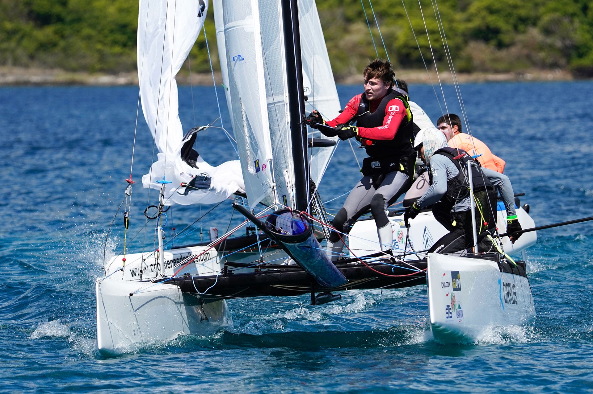 Au final, avec un vent établit entre 5 et 11 nœuds sur l’eau, la flotte a toujours navigué collé – serré. Sur l’eau, effectivement, il fallait serrer les dents, comme le confirme Orion Martin 3è de la manche du jour : C’était très difficile mentalement, il y avait peu de vent et des vagues, ce que nos bateaux n’aiment pas du tout parce qu’on a du mal à prendre de vi tesse. En plus, notre équipage est plutôt lourd donc ces conditions ne nous sont pas très favorables. Je dois vraiment remercier Charles, mon équipier. Il m’a remotivé à un moment où je commençais à perdre patience et à m’énerver. Il faut rester concentré, la route est longue et Charles a su me le prouver et je l’en remercie. Sans lui, je pense que j’aurai tout jeté dans la voile !