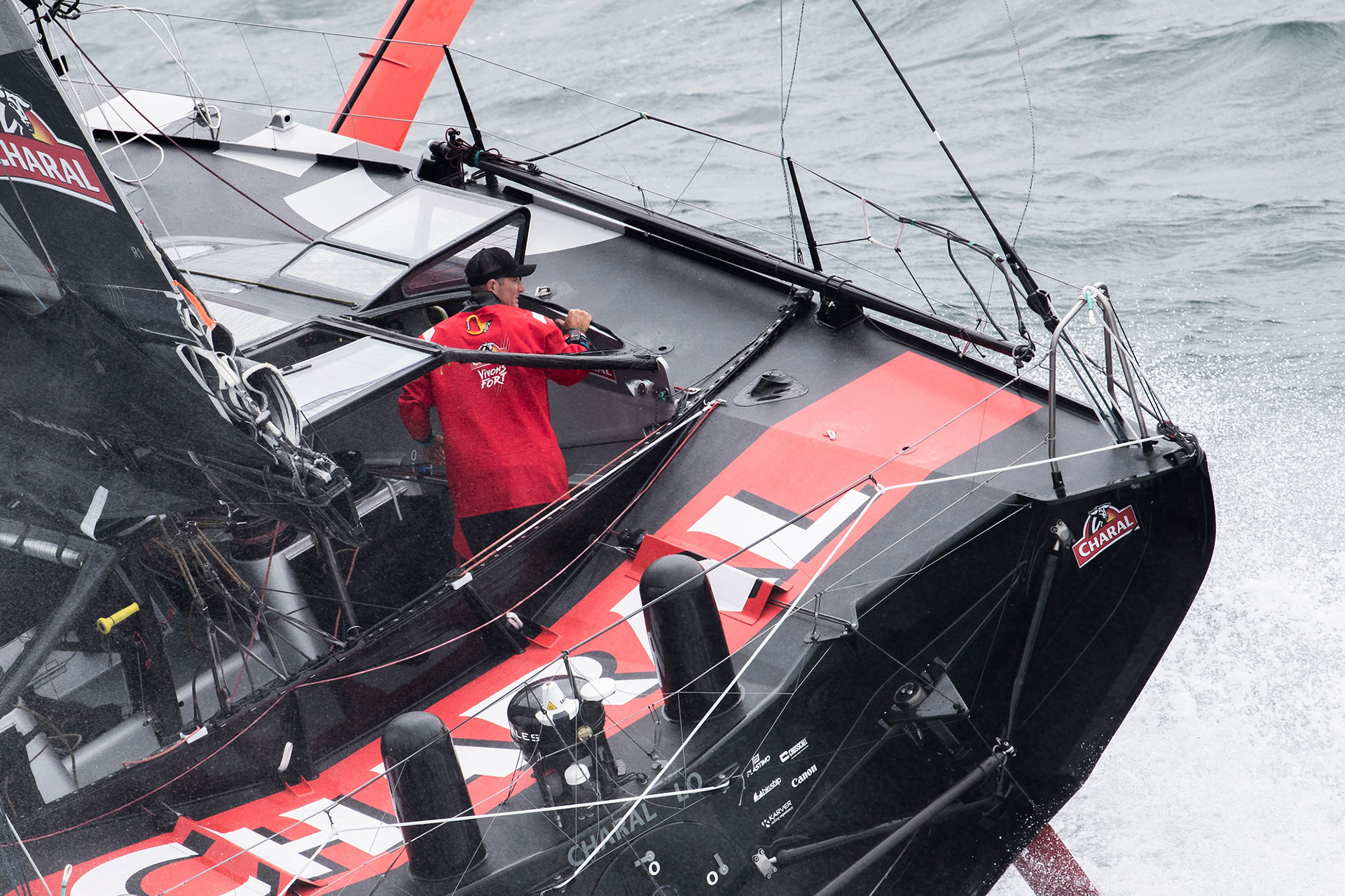 « Là, nous sommes au portant, ça glisse ! Il fait frais mais super beau. Ces conditions permettent de reposer la machine, de faire le tour du propriétaire. Il y a des petits trucs, j’avais par exemple un fil électrique débranché sur mon vérin de pilote, donc j’ai bricolé un peu. Je suis super content d’être là et je ne désespère pas vis-à-vis du petit groupe devant moi. C’est vraiment un chouette exercice. Le matossage et tout ça, c’est bien tonique. Et puis ça change complètement. On a d’abord eu du près, on tirait des bords et puis là, on est au portant, mais on monte bien vers le Nord ! C’est comme un grand triangle Olympique. C’est l’exercice idéal avant un Vendée globe. C’est vraiment bien pour tester le bateau et le bonhomme. Je suis très content de ce qu’on a fait cet hiver sur le bateau, la casquette pour se protéger des embruns par exemple. Par contre, j’ai oublié mes gants ! C’est peut-être une bêtise car je commence déjà à avoir les mains qui brûlent. J’ai pris trois bonnets, et ça, c’est peut-être un peu exagéré ! Là, il fait nuit, mais c’est une nuit relativement claire. Je vais apprécier le rayon de soleil du matin, il fait seulement 10 degrés. C’est plus agréable d’avoir des nuits plus courtes. Manœuvrer de jour c’est quand même plus facile. C’est une drôle d’impression, mais c’est agréable. On dirait un peu qu’on a un projecteur sur nous. C’est agréable pour régler les voiles, manœuvrer un peu. Ça change par rapport à des nuits normales. Dans les heures qui suivent il va y avoir un virement de bord, c’est la position du virement de bord qui va être très importante, et le placement dans le vent faible. C’est plutôt du petit temps, du vent maniable. J’ai gagné un peu dans le nord en essayant de couper un peu le fromage. »
