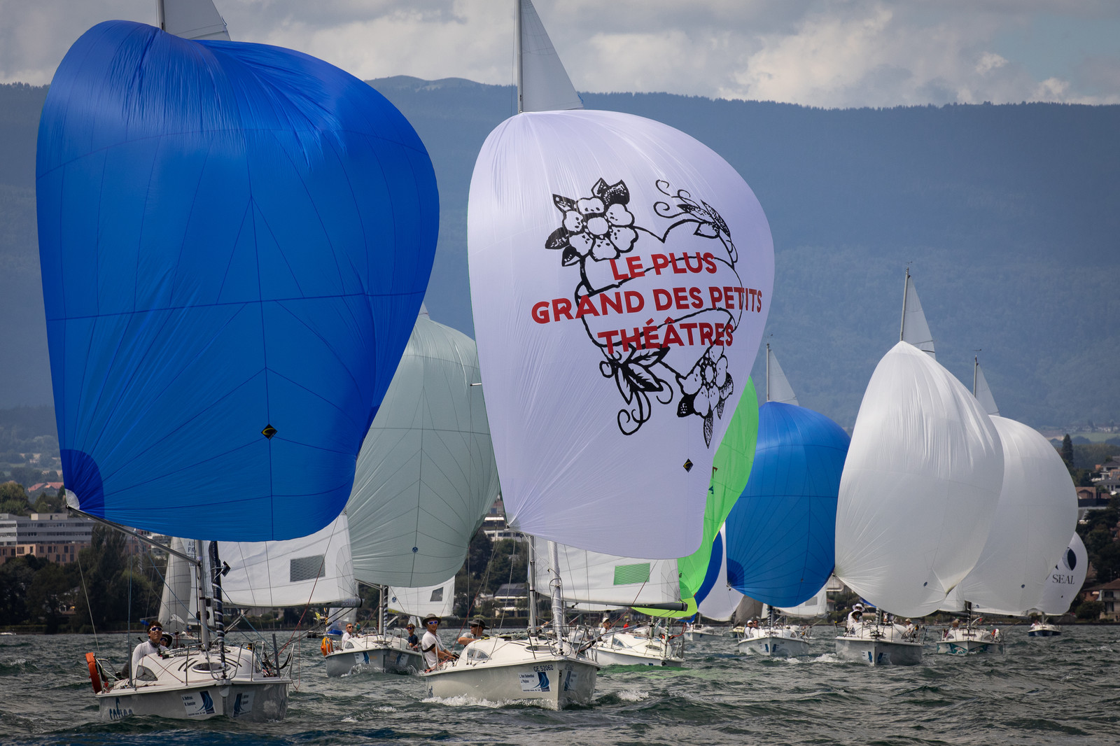 Le vent soufflant à 10-12 noeuds du sud-ouest a offert un magnifique prologue : les 40 duos ont tourné trois bouées devant Vidy avant de prendre le large direction Genève. Classement purement anecdotique vu les 120 heures de navigation restantes, le premier bateau à avoir pris le large en tête après le prologue est va….rhum9, mené par le triple vainqueur des 5 Jours Eric Monnin et son équipière Ute Wagner, experte du Match Race elle aussi. Ils étaient suivi de près par les incontournables navigateurs lémaniques Edouard Kessi et Philippe Durr (Girod Piscine), puis du jeune équipage du Centre d’Entraînement à la Régate, Victor Casas et Mathieu Cadei (CER VdG). A l’heure où ce communiqué est envoyé, Fou du Vent (Loris von Siebenthal et Jérôme Plojoux) sont en tête au large de Thonon.