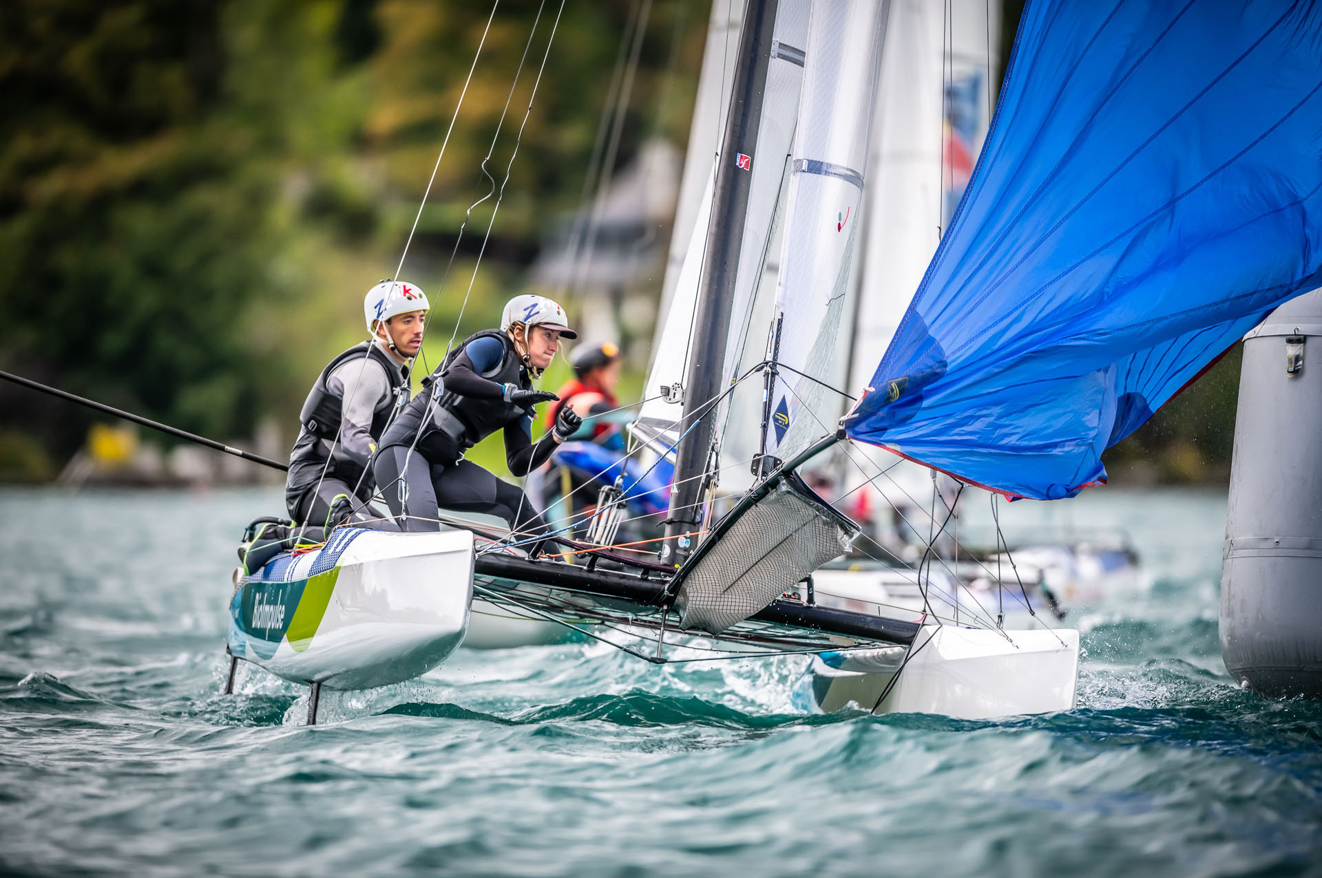 Après un arrêt complet des compétitions internationales depuis le printemps, ce championnat d’Europe était très attendu. Encastré dans les Alpes, le lac d’Artersee s’est montré fidèle à sa réputation : capricieux. Toute la semaine, les conditions météos sont restées difficiles avec un vent froid particulièrement instable. Finalement, avec 12 courses disputées, les français ont su rester concentrés jusqu’au bout et s’octroient aujourd’hui une magnifique 2ème place derrière les italiens triples champions d’Europe et champions du monde Ruggero Tita / Caterina Banti, devant les champions du monde 2019 Vittorio Bissaro / Maelle Frascari (3ème) et les anglais John Gimson/ Anna Burnet (4ème), champions du monde 2020.