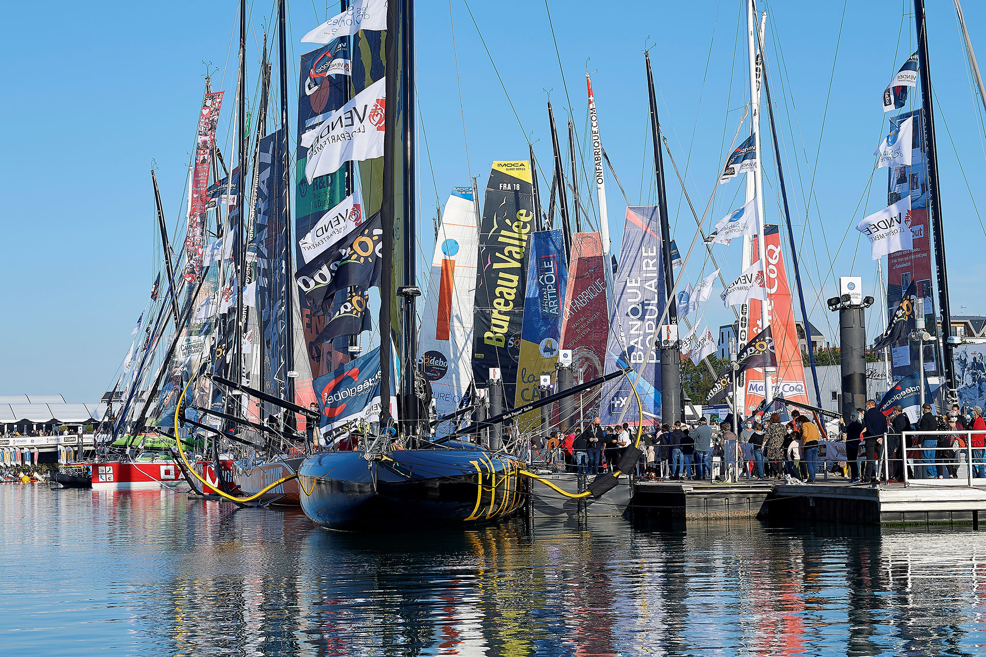 En dépit des consignes sanitaires limitant le nombre de personnes admises dans l’ enceinte de 30 000 m2, les visiteurs sont au rendez-vous et ont profité pendant sept jours d’une météo radieuse pour s’imprégner de l’atmosphère de la course. Le ponton du Vendée Globe où pavoisent les 33 IMOCA est le principal lieu d’attraction. Car ce sont bien les bateaux, exceptionnels, et les futurs héros de cette 9e édition, qui catalysent la curiosité, l’étonnement et l’admiration. Les marins répondent avec bonheur aux sollicitations de leurs fans : un salut, une lettre donnée, un dessin offert, une pause pour la photo, des questions d’enfant – « c’est quoi ce poteau qui penche là, ça va tomber ! » s’inquiète un petit garçon en montrant du doigt l’outrigger de Charal.