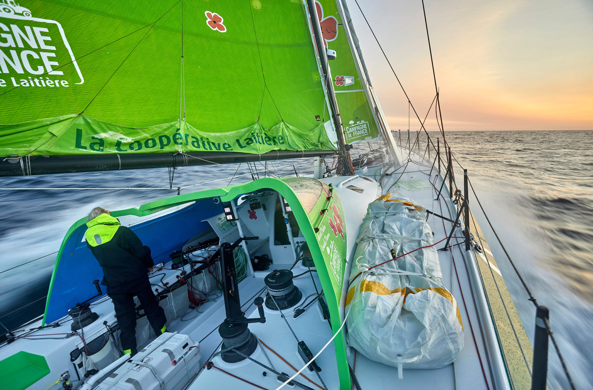 Les foilers, voiliers équipés de ces plans latéraux porteurs, devraient rapidement « s’envoler » dans des conditions faites pour eux, et toute la flotte devrait, une fois la bouée de dégagement enroulée, mettre cap à l’ouest, au devant d’un petit front qui, une fois rapidement passé, proposera une phase de navigation au portant. Mais un deuxième front sera en approche au large du cap Finisterre, avec cette fois des vents de plus de 30 noeuds, sur une mer beaucoup plus hâchée. Point d’alizés portugais cette année, et une route assez éloignée des côtes espagnoles, où sévissent habituellement grand nombre de bateaux de pêche. Entre la négociation de ces fronts, beaucoup de travail pour Miranda, à la fois dans le choix de ses trajectoires et de ses virements de bords, et dans les lourdes manoeuvres de changement de voiles et de matossage à opérer. Des premières 24 heures d’une belle intensité qui vont plonger sans transition la skipper de Campagne de France dans la réalité de son tour du monde.