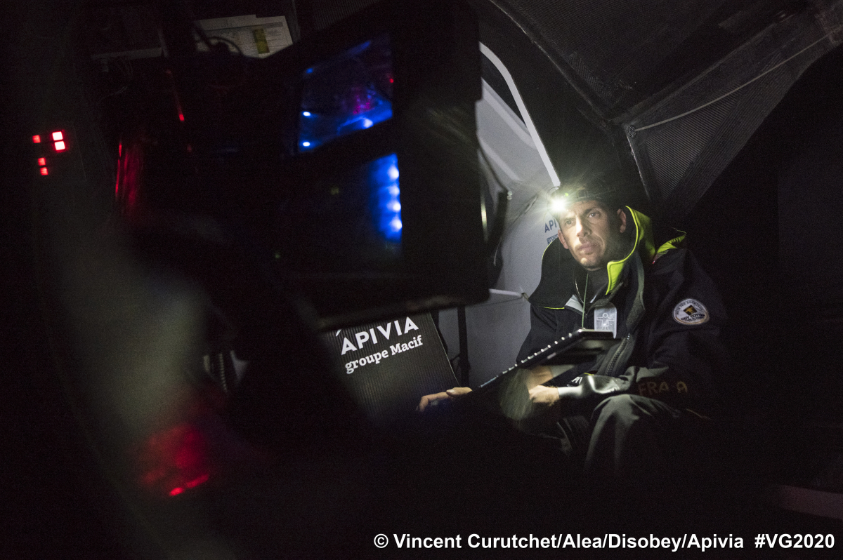 Le directeur de course n’a pas beaucoup fermé l’œil cette nuit et il n’est pas le seul. À Concarneau, une partie de l’équipe d’Apivia s’est retrouvée physiquement pour former une « cellule de veille » autour d’Antoine Carraz, le responsable du projet. En somme, une « Situation Room »* pour un monocoque, une façon de rester en permanence en contact avec son skipper. À 2h19, Jacques Caraës reçoit un texto d’Antoine Carraz : « On vient d’avoir Charlie. RAS à bord ». Pas besoin de long discours quand on résiste à de telles conditions.
