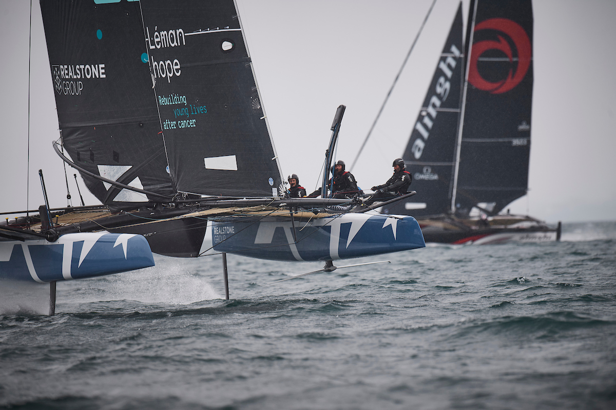Samedi 15 mai, les conditions sont intenses avec un vent constant de 12-15 nœuds. La pluie est incessante, il fait très froid, mais la bataille sur l’eau elle est brûlante ! Avec des vitesses à plus de 30 nœuds, les régates sont engagées, ça navigue vite et bien et la moindre petite erreur coûte cher au classement. L’équipe d’Esteban Garcia, co-skippée par Jérôme Clerc avec Sébastien Col à la tactique choisit les bonnes options et s’impose à trois reprises sur les quatre manches disputées. Realteam Sailing monte ainsi provisoirement sur la première marche du podium. Mais rien n’est joué à l’issue de cette deuxième journée car Alinghi est très proche et les cartes peuvent encore être redistribuées le lendemain.