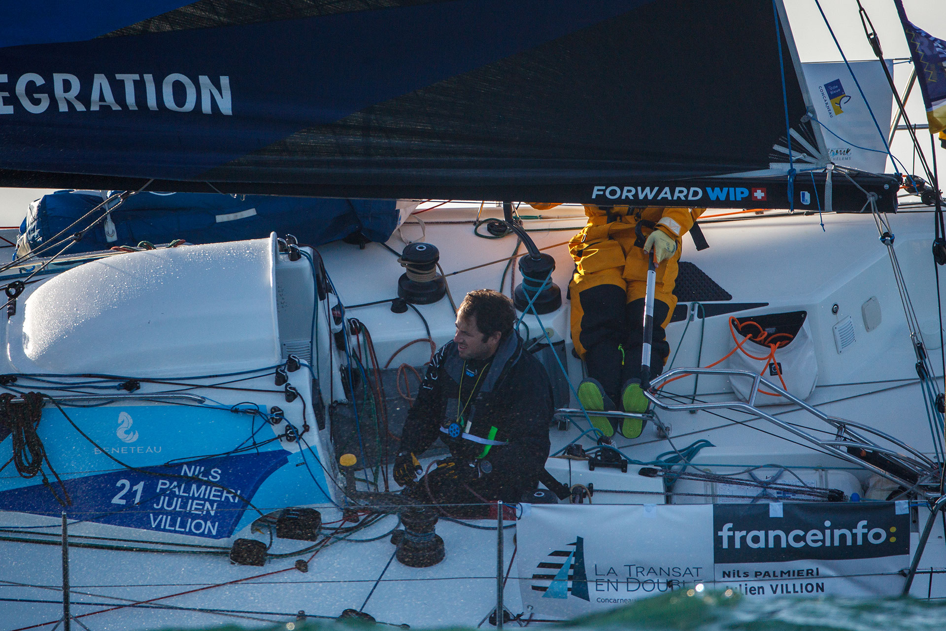 S’il fallait décrire les 48 premières heures de course en trois mots, on opterait pour «penchées », « humides » et « inconfortables » – ou des synonymes. Aujourd’hui, les duos ont fait face à un renforcement progressif du vent qui a tourné au secteur sud-ouest, c’est-à-dire pile dans l’axe de leur route pour atteindre le cap Finisterre (au nord-ouest de la péninsule ibérique). Ils ont dû, probablement à regret, affaler le gennaker et repasser sous foc. Les 13 premiers concurrents ont tiré des bords au ras de la côte. « Nous faisons du près sous les falaises, c’est très beau même si ça manque un peu de soleil. Cette navigation demande beaucoup d’énergie », racontait Corentin Douguet (Quéguiner – Innoveo). Le témoignage de Guillaume Pirouelle (Région Normandie) allait dans le même sens : « C’est fatiguant tous ces virements où il faut matosser tous nos sacs à chaque fois. Mais bon c’est pour doubler les petits copains donc ça vaut le coup ! On ne lâche rien pour rester au contact. »