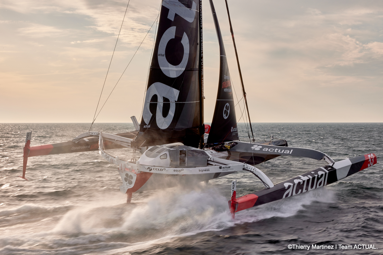 « Nous avons sensiblement gagné en aisance à bord. Et le niveau de performance du bateau est très élevé. » Lors de leur dernier entraînement, bord à bord avec l’Ultim SVR Lazartigue de François Gabart, le team Actual a en effet à nouveau flirté avec les 45 nœuds…