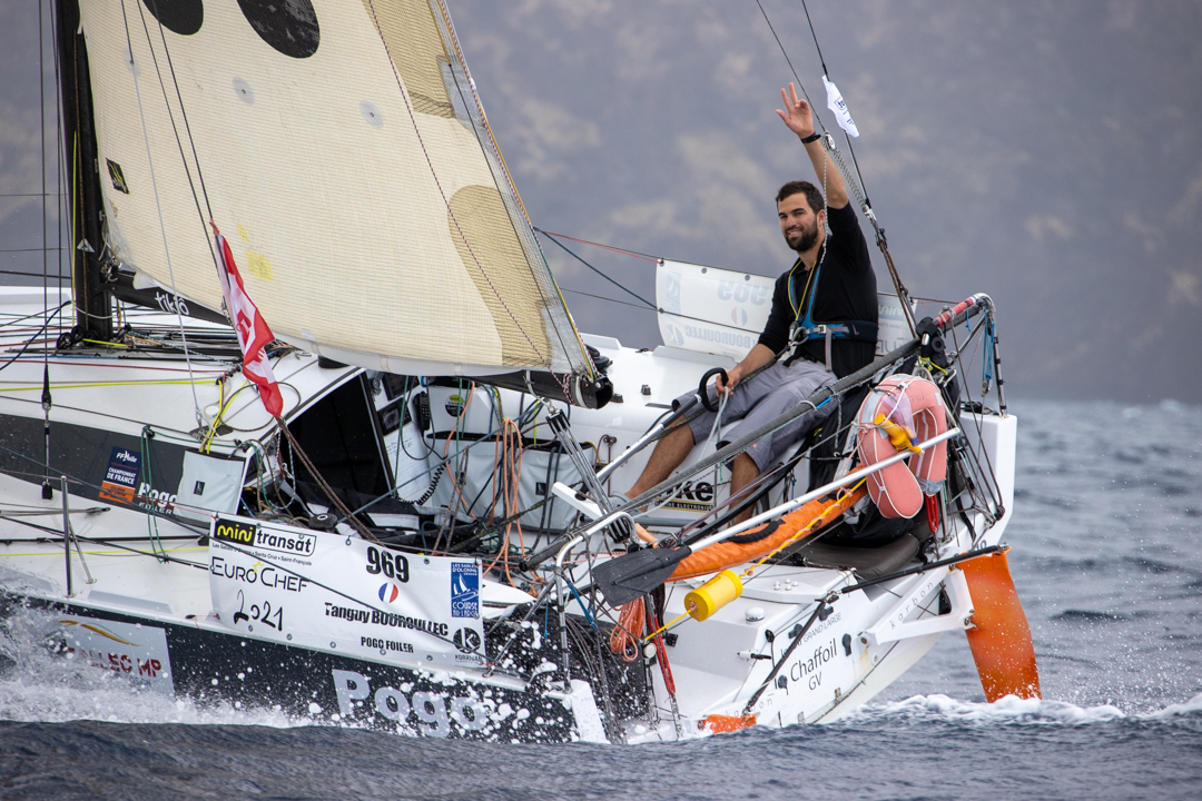 Tanguy Bouroullec – Fabio Muzzolini – Pierre Le Roy : tel est finalement, dans l’ordre, le tiercé gagnant (avant jury) chez les Proto de la première étape de la 23e Mini Transat EuroChef. Et quelle étape ! Marquée par une traversée du golfe de Gascogne tonique, un débordement du cap Finisterre déterminant qui a permis à une petite bande de quatre de prendre la poudre d’escampette, mais aussi par un remarquable finish avec un écart de moins de 1h10 entre les trois leaders, celle-ci a assurément tenu toutes ses promesses !