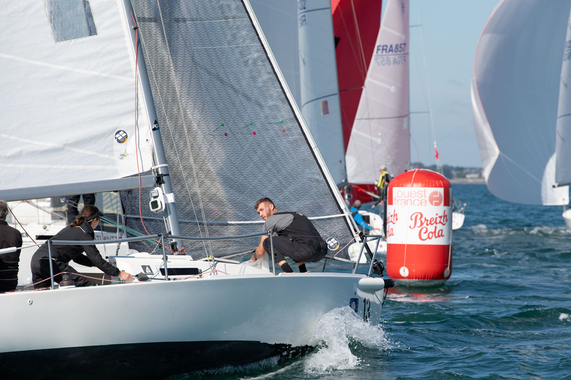 L’impatience se faisait sentir aux alentours de 11h, à quelques secondes du coup de canon. Rappel général sur le rond Saint James qui voyait plusieurs équipages mordre la ligne. Ce rond comprend les catégories Osiris et IRC, où des bateaux de toutes tailles se confrontent, un heureux mélange d’équipiers amateurs et de têtes d’affiche. Le Contention 33 Blue Moon de Sam Prietz, par exemple, dispose d’un tacticien de choix : Bernard Mallaret (18 Tour de France à la Voile). A bord de l’A35 Locmalo, Antoine Carpentier, vainqueur de la Transat Jacques Vabre, apporte toute son expérience. Sur le rond Breizh Cola, les Open 5,70, 7,50 et Mach 6,50 ont également « mordu » la ligne avant le top départ. C’est dire si on se chamaille à tous les étages sur le Spi !
