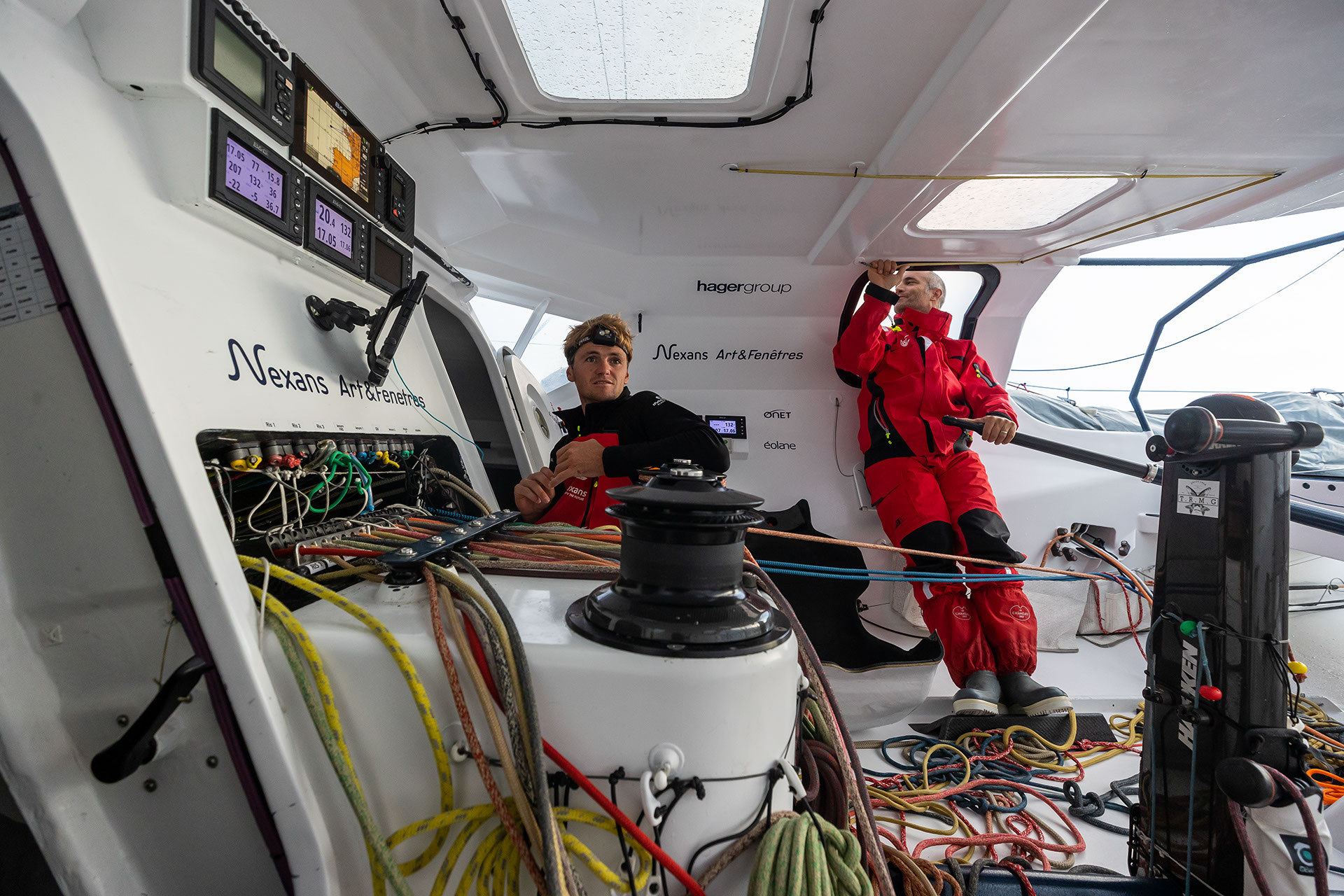 Le skipper revient avec enthousiasme sur son parcours : « On est partis avec du vent un peu mou, ce qui nous a permis de tester le grand spi, le grand gennaker et le code 0. Ensuite, le vent a forci avec l’approche d’un premier front qu’on a traversé. On a pu constater que les réparations du bateau tenaient et qu’il se comportait bien. » Après une zone de molle, nouveau coup d’accélérateur. « On a cavalé à l’avant d’un front pour revenir à la pointe de la Bretagne ». Nexans – Art & Fenêtres a ainsi filé pendant plus de 10 heures à plus de 20 nœuds ! « C’étaient de très bonnes sensations », apprécie Fabrice. Le marin salue aussi l’investissement de son équipier : « on a tout de suite eu les bons réflexes. Nous n’avons pas perdu de temps pour trouver nos marques et c’est forcément très agréable ».