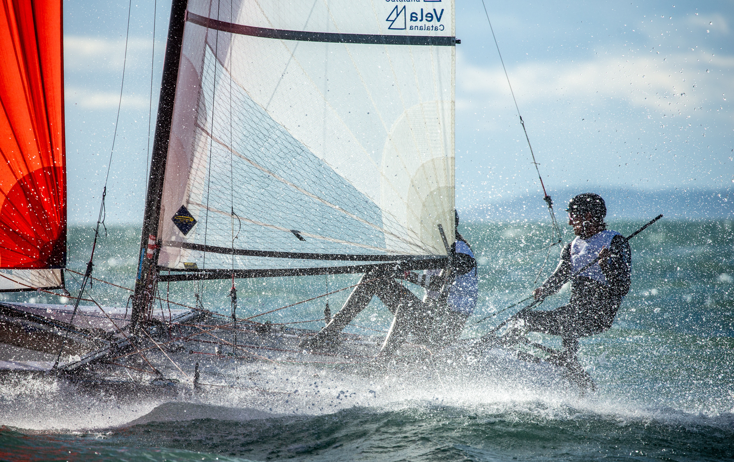 Du vent extrêmement mou puis… une seule manche extrêmement sportive et … des images extrêmement spectaculaires, voilà qui résume cette première journée des Championnats du Monde Nacra15. Les tandems Gueslin Grimaud/ Declef (FRA) et Rondeau / Garcia (ESP) s’imposent dans leur groupe respectifs.