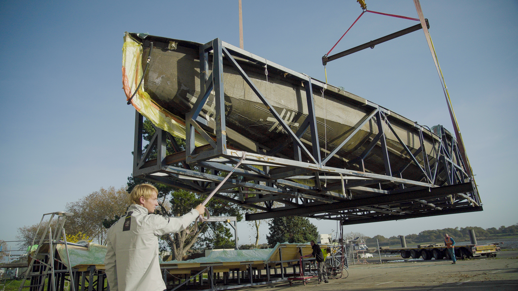 L’impressionnante opération s’est déroulée ce jeudi en début d’après-midi « dans les meilleures conditions » se réjouit le skipper avant de préciser « le remarquable travail opéré par Multiplast, MerConcept et mon équipe ». D’ici environ 3 semaines le pont du bateau suivra le même trajet. La structure de l’IMOCA finalisée à 80%, pourra bientôt être intégrée. Reste désormais à assembler toutes les pièces.