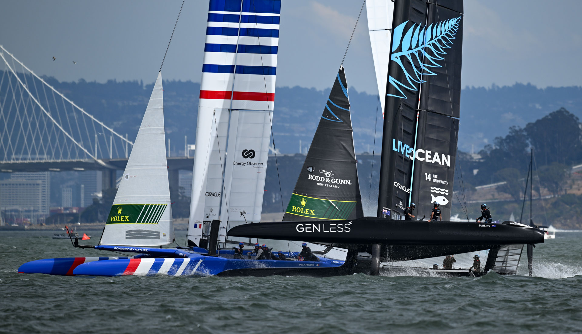 Sous un ciel chargé et dans des conditions de vent erratiques, les 8 équipes ont attaqué la dernière journée du Grand Prix de San Francisco sur les chapeaux de roues, dans une brise oscillant entre 16 et 25 nœuds. Aile intermédiaire de 24 mètres, petits foils et petits safrans, c’est dans une configuration identique à celle d’hier que la flotte du SailGP s’est élancée.